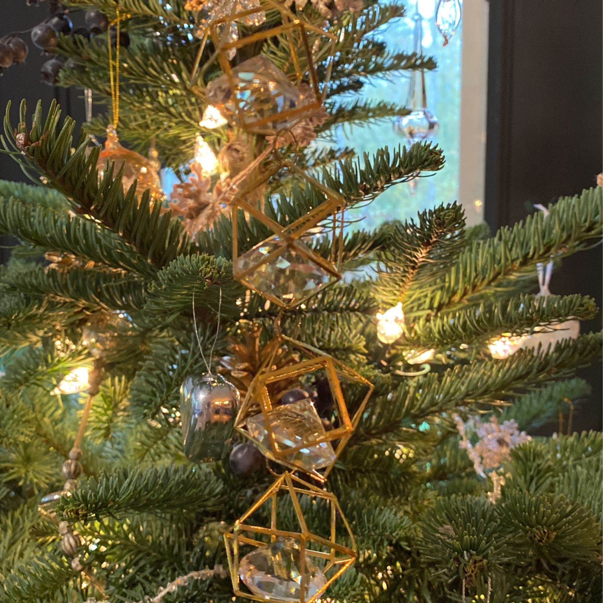Prices marked individually, contact me for details - baby pink and turquoise glass balls - Jim Shore pastel bird ornament - Jumbo white sparkle pinecone and gem cage - Various white ornaments including sparkle pinecone, deer and tree beanches - Turquoise icicles and candy cane squares - White faux poinsettia in various sizes - Glitter butterfly clip, small white bird clips - Small white glitter stand up Christmas tree - Small silver poinsettia clips with additional glitter silver foliage - Set of two gem chandelier ornaments (crystal and gold) - Set of two green hurricanes for tea light, matte gold base, white snow/birch tree detail - roughly 20 gold glitter pinecones of various sizes
