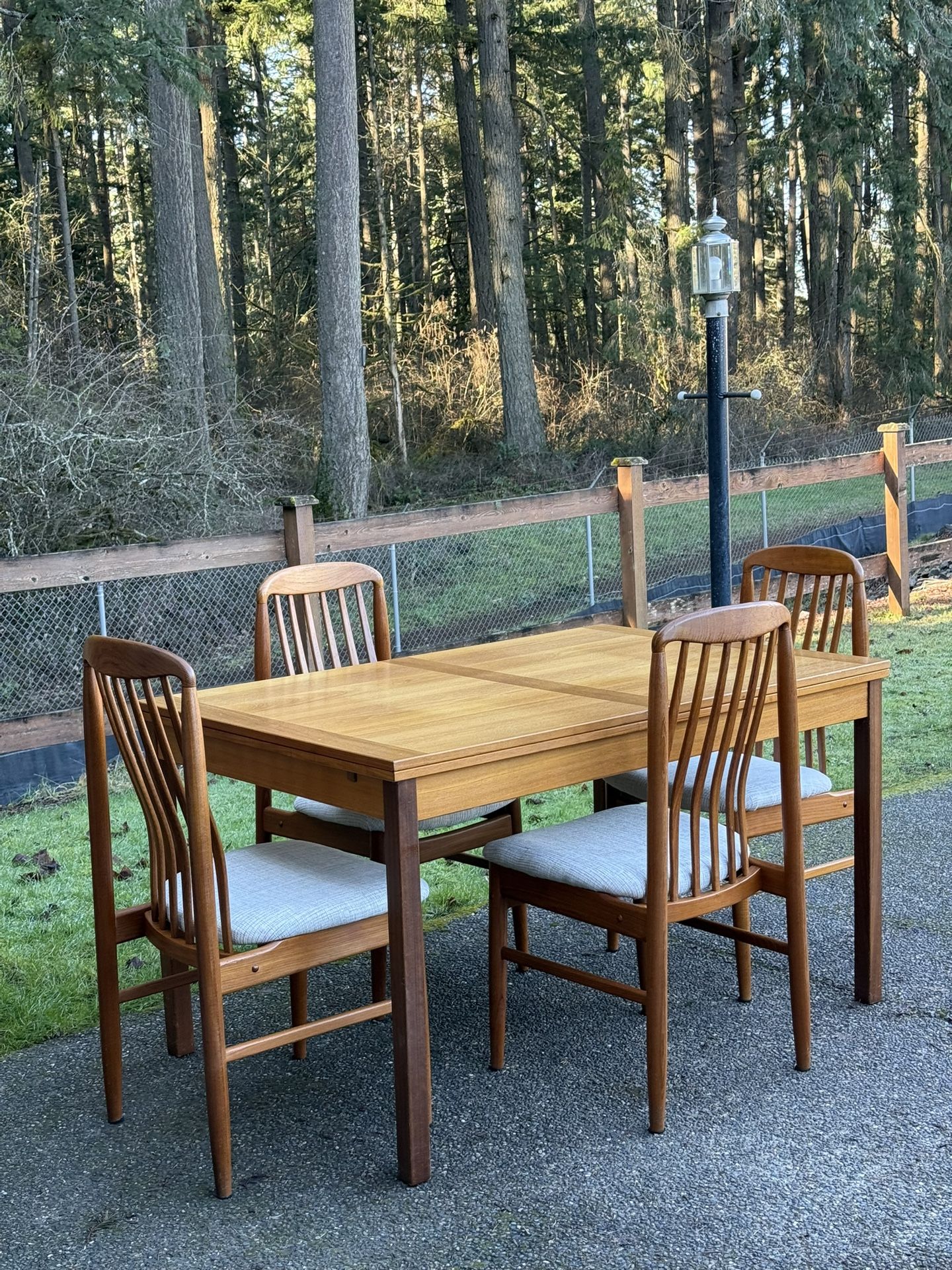 Vintage Mid Century Modern Danish Teak Extendable Dining Table Set-4 Classic Scandinavian design. Dimensions: 53.5"L x 35.5"W x 30"H Extends to 93"L with two leaves seats 8-10 made in Denmark Legs do come out easily for transportation Delivery available for a fee Danish Modern Teak Benny Linden Dining Chairs set of 4 Excellent vintage Condition. Frames has been refinished. New fabric 22 inches wide; 19 inches deep; 37 inches high; 18 inches seat height