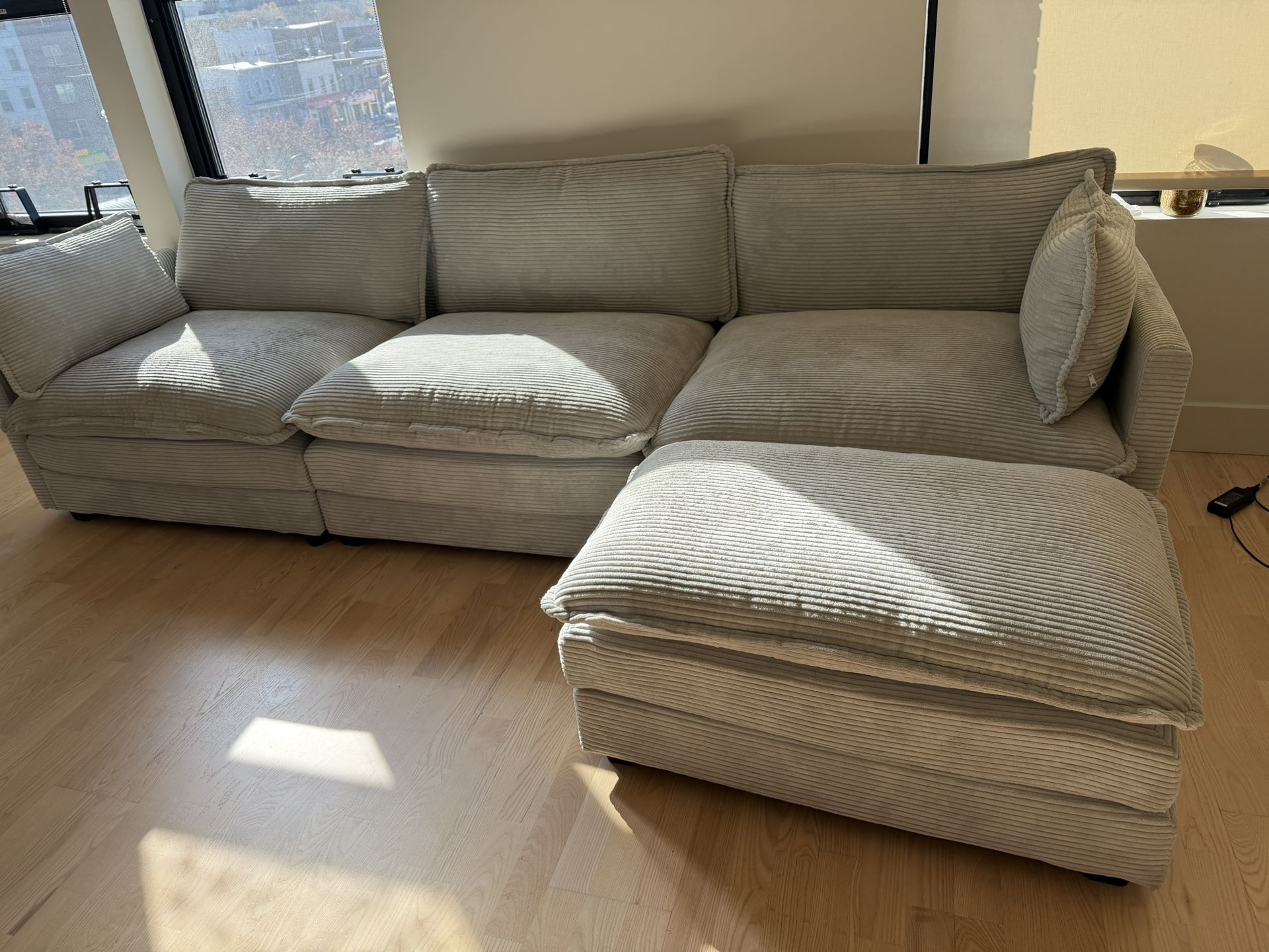 Sectional sofa with chaise. It’s super comfortable, deep-seated, and in great condition — no stains, no damage, and from a clean, pet-free, smoke-free home. Dimensions: Total length: 101.6”, Back width: 112” Seat depth: 24”, Chaise depth: 35.4” Seat height: 18.9”, Overall height: 33.5” Pickup only.