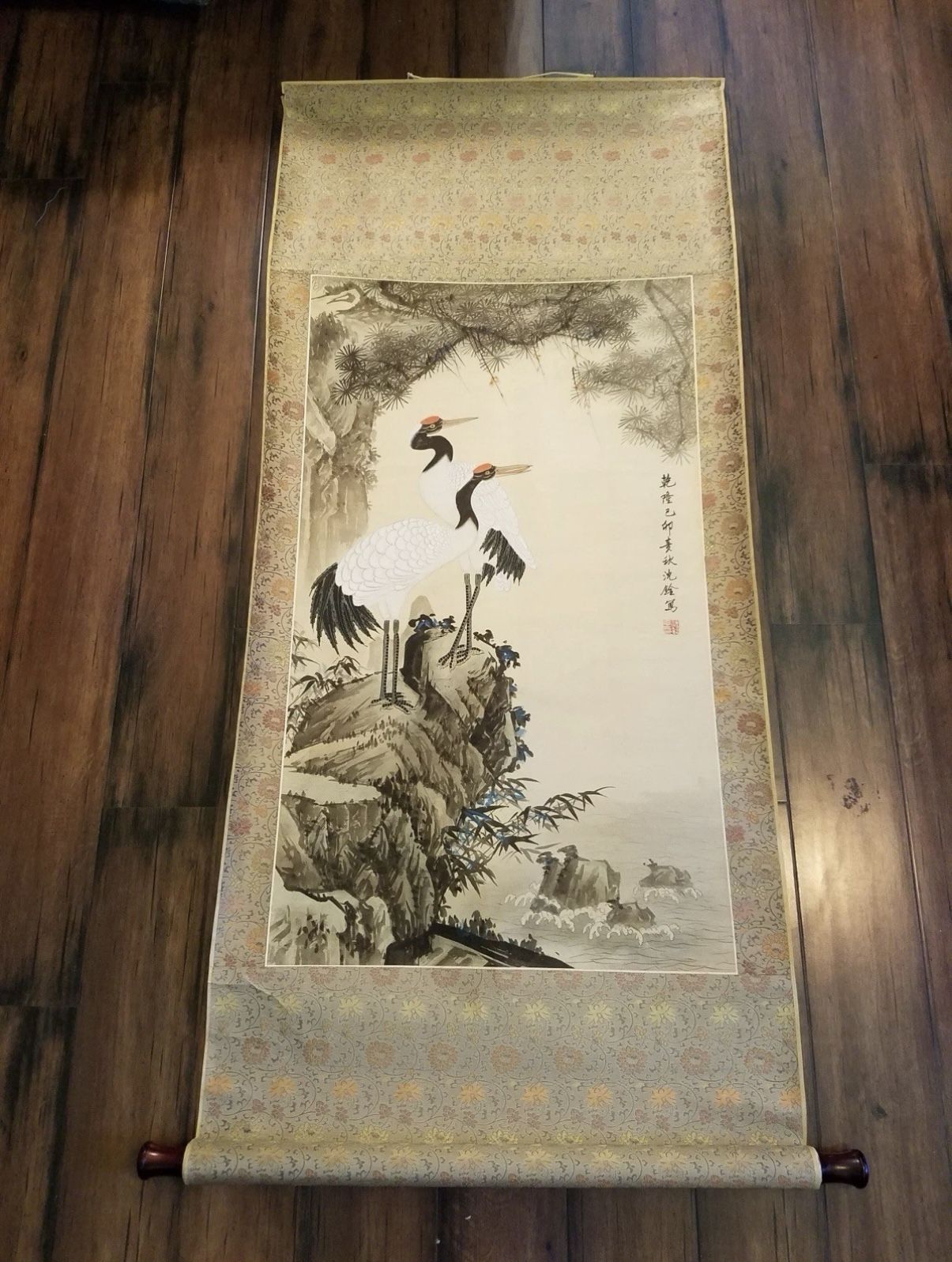 For your consideration is a scroll of Chinese painting, it shows two cranes under pine trees, it means longevity. The painting is measured 23 x 52". It was torn at left corner of the bottom as shown in the last picture. Otherwise It is in good condition.
