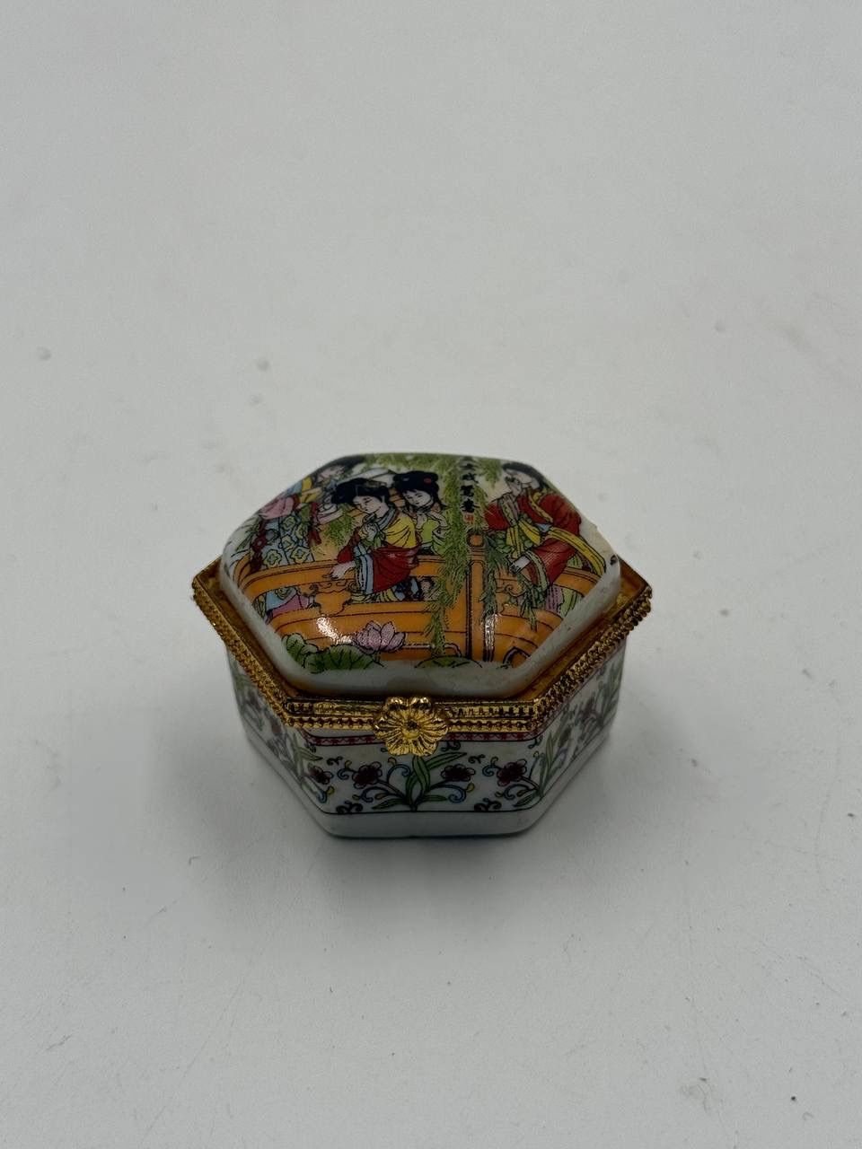 The Vintage Chinese Porcelain Trinket Box is a hexagon-shaped jewelry box adorned with gold trim, showcasing traditional Chinese culture and craftsmanship. Made in China, this trinket box is a collectible piece that adds an Asian touch to any decor. Perfect for storing small treasures or jewelry, this unique item is a charming addition to any collection of Chinese artifacts or antique pieces. Vintage Chinese-style porcelain trinket box featuring traditional Asian court scene artwork. Hexagonal shape with hinged lid and ornate gold-tone metal trim. Perfect for jewelry, rings, keepsakes, or small collectibles. Details: • Porcelain trinket / jewelry box • Hexagon shape • Hinged lid with gold-tone metal trim • Hand-painted style Asian scene • Condition: Very good vintage condition • No chips or cracks noted (see photos) A beautiful decorative piece for Asian décor collectors or vintage porcelain enthusiasts.