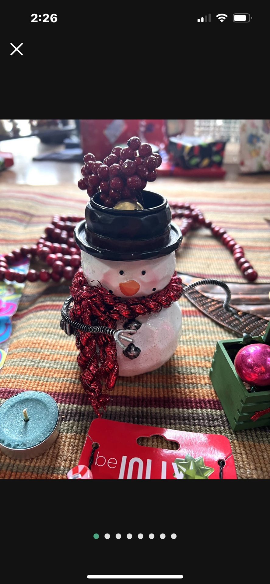 21 New plastic Gift bags, New Light up candy cane necklace, 5” High Ceramic Snowman with moveable arms, 8.5 feet wooden beads, window cling ons, votive candle holder, 4” red tin pail with fluff around top, tin 14” copper color Angel, tiny miniature hanging tree decorations and many more items. The wooden beads alone would probably run $5 or more in a store.