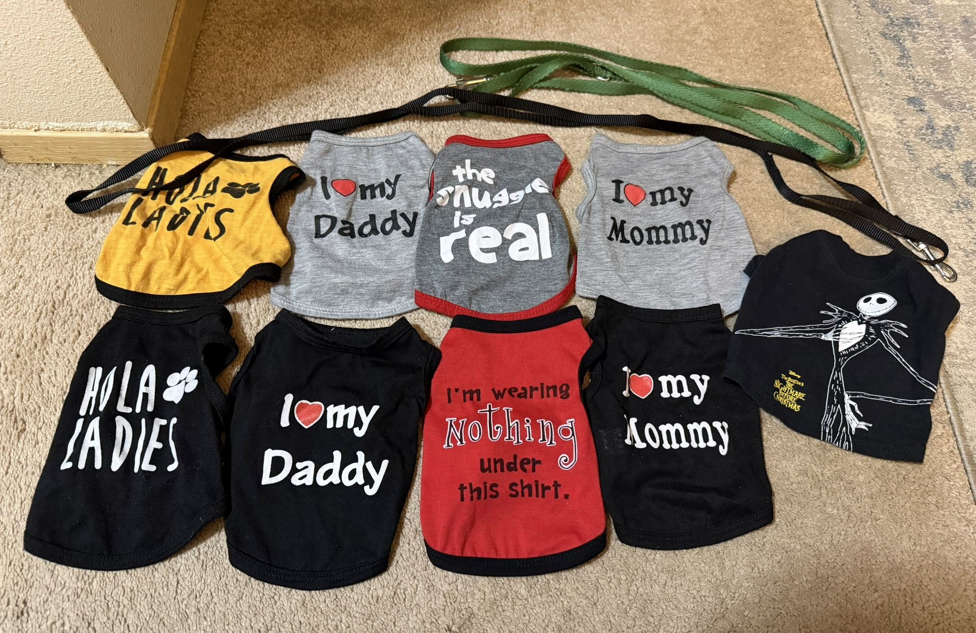 XXS Clothing bundle for small breed dogs or puppies. Selling everything in the pictures in a bundle. Two 8 inch leashes included.