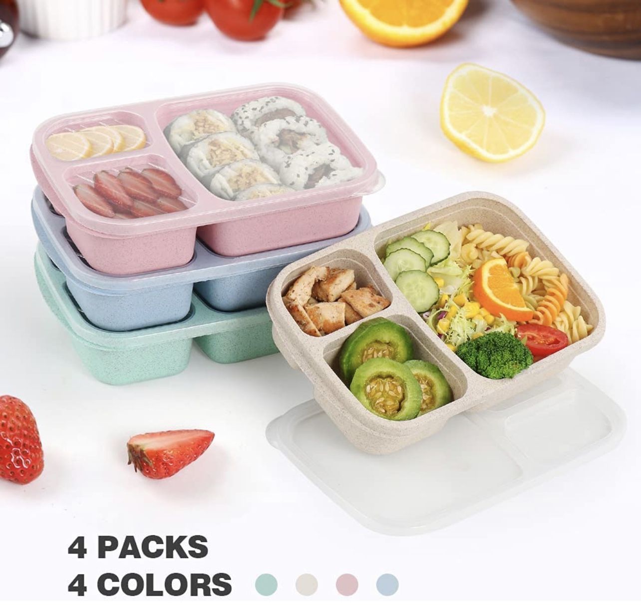 New 4 Pack Lunch Box Stackable Containers 3 Compartment Meal Comes With Spoon Fork And Chopsticks BPA FREE