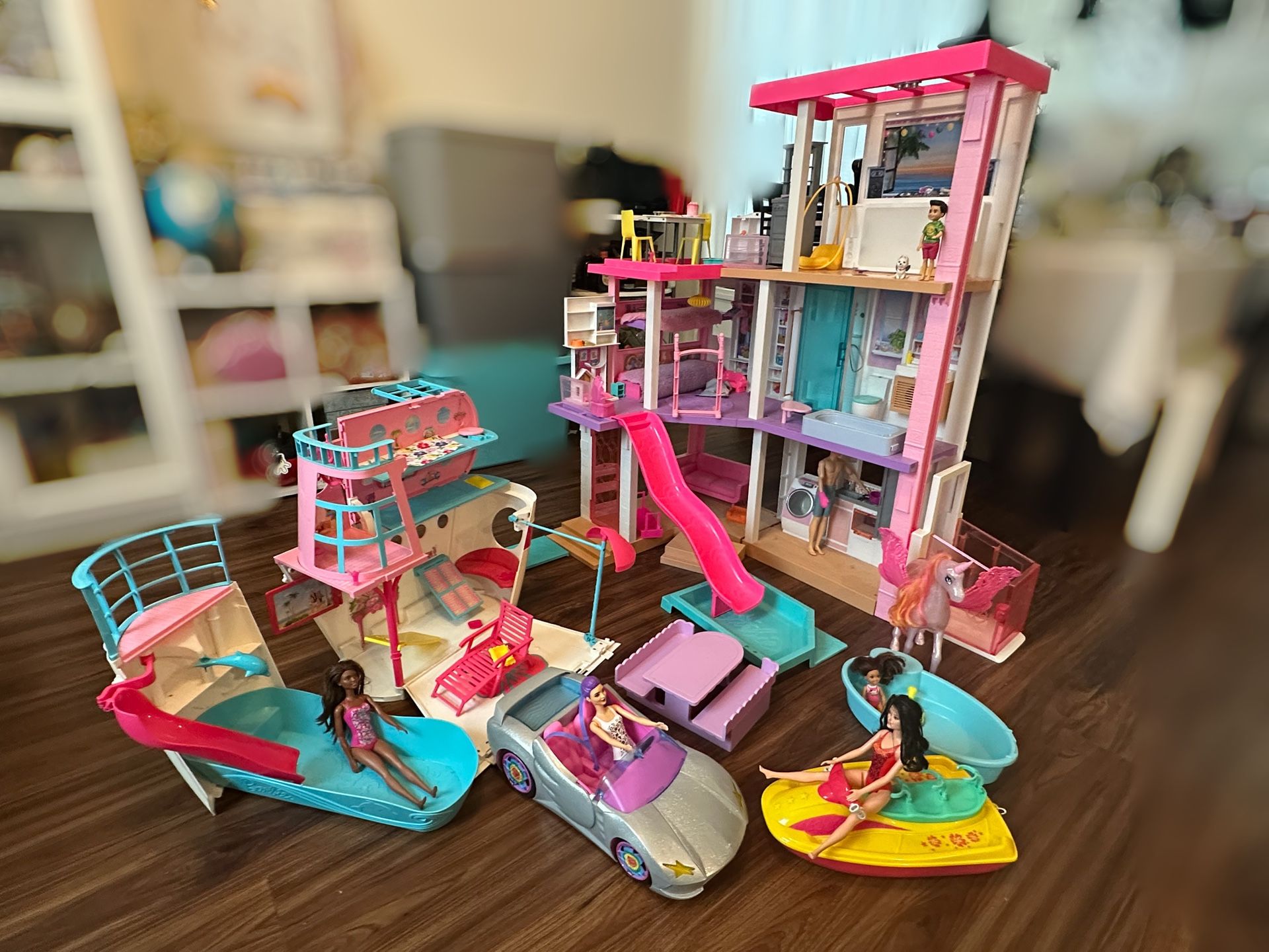 Barbie House with Double Decker Yacht, Convertible, & Pegasus! Over $200 total value. ⭐️Barbie House - Like New ⭐️Double Decker Yacht - Used Condition ⭐️Convertible - Like New ⭐️Pegasus - Good Condition Comes with all Barbie items pictured