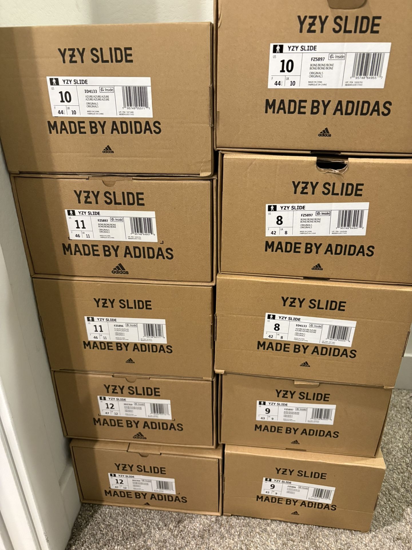 Hey, got some brand new YZY SLIDES for sale! Still in the box. Sizes and colors available are: Size 8 bone/azure, Size 9 bone/flax, Size 10 bone/azure, Size 11 bone/flax, and I've got two pairs of Size 12 in black. Hit me up! Men’s sizes 8-12……..2/$100 deal on all sizes and colors