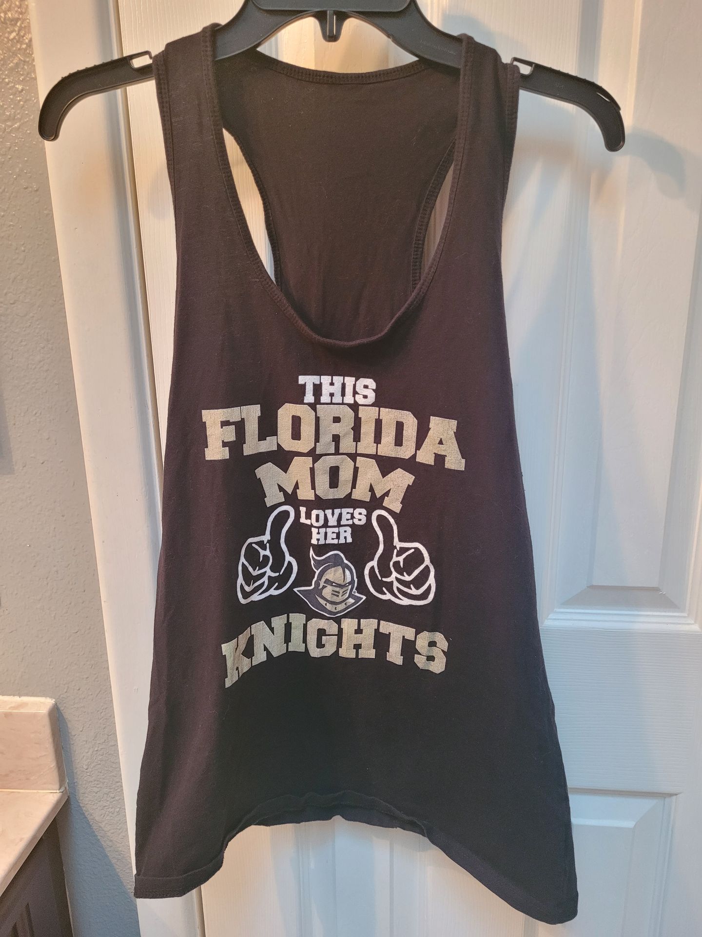 This racerback tank top is a piece of fan apparel for the UCF Knights, the athletic teams representing the University of Central Florida. The graphic features the text "This Florida Mom Loves Her Knights" in a collegiate-style font, alongside a UCF mascot logo between two "thumbs up" graphics. Note: Small pin hole in Top as shown in pic Measures 17 inches Pit to Pit and 27 inches from Top of Shoulder to bottom of Top