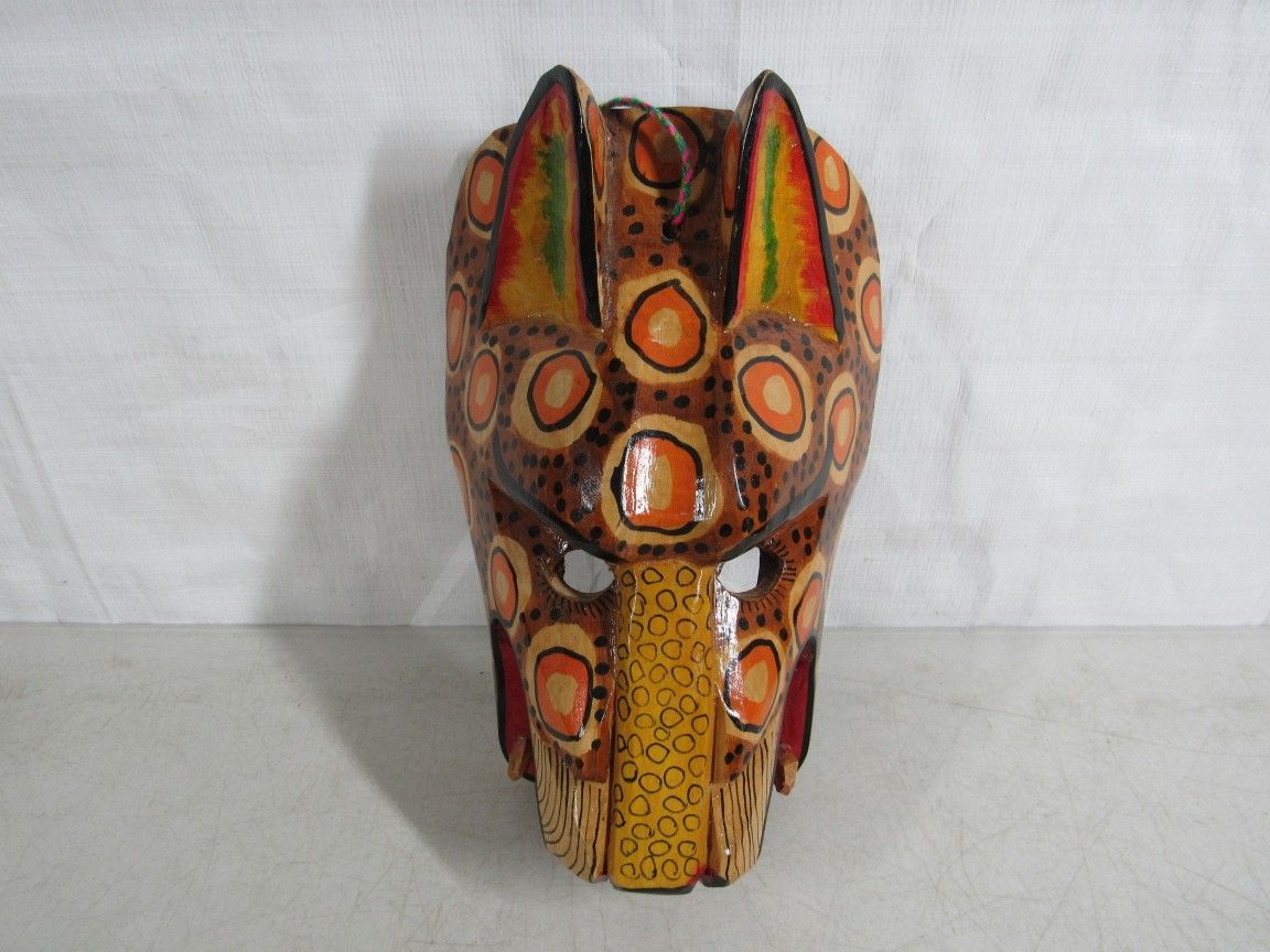 The Jaguar mask is 10 1/2" height X 6 7/8" width. Made of hand crafted wood. Very good condition. No broken or missing parts. See photos