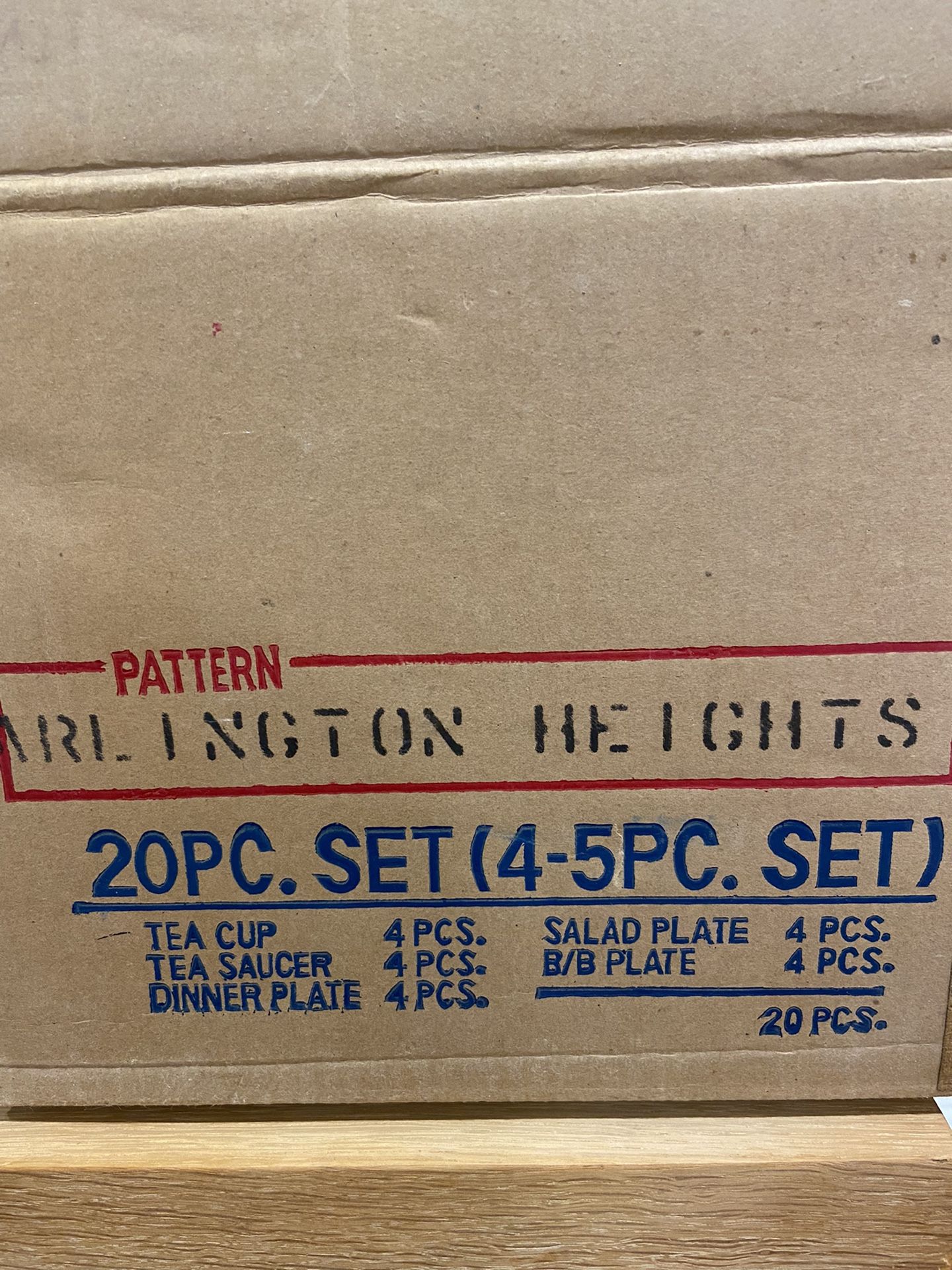 4 place settings of 5 pieces per setting. Contents noted in photo. It also includes salt and pepper shakers. Set is in brand new condition as the pieces have never been used and are packaged as they were on the day the were purchased.