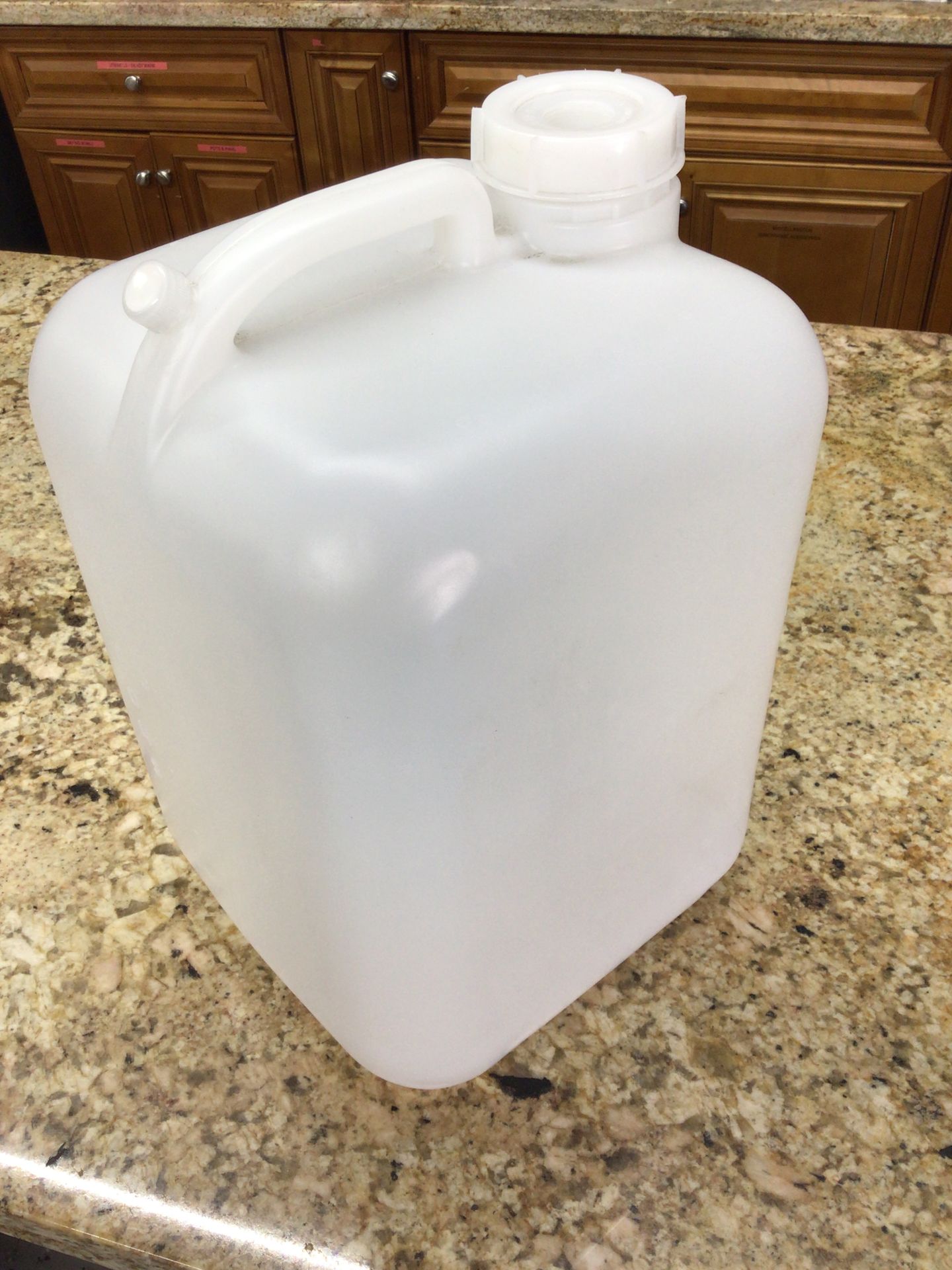 5 gallon vented plastic Hedpak/Carboy with Cap. New and unused. Special venting capon the handle allows smooth product flow while dispensing and prevents “chugging” Semi-rigid, high density polyethylene with a molded top handle, bottom finger grips, and a large 70mm screw cap opening for easy lifting and fast filling and pouring.