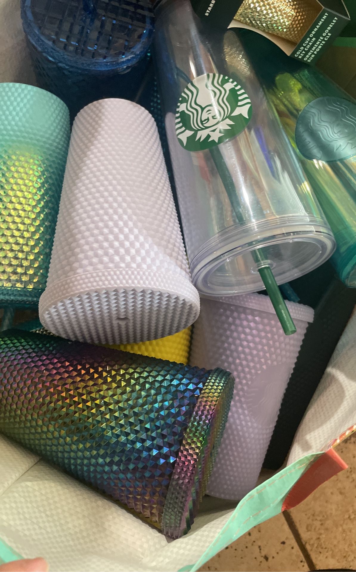 All in good condition The smaller cups, some are missing straws But other than that, they’re in really good condition Trying to sell the whole bag About 25 Starbucks cups Making an offer Pick up only They’re all used, but in good condition only used once