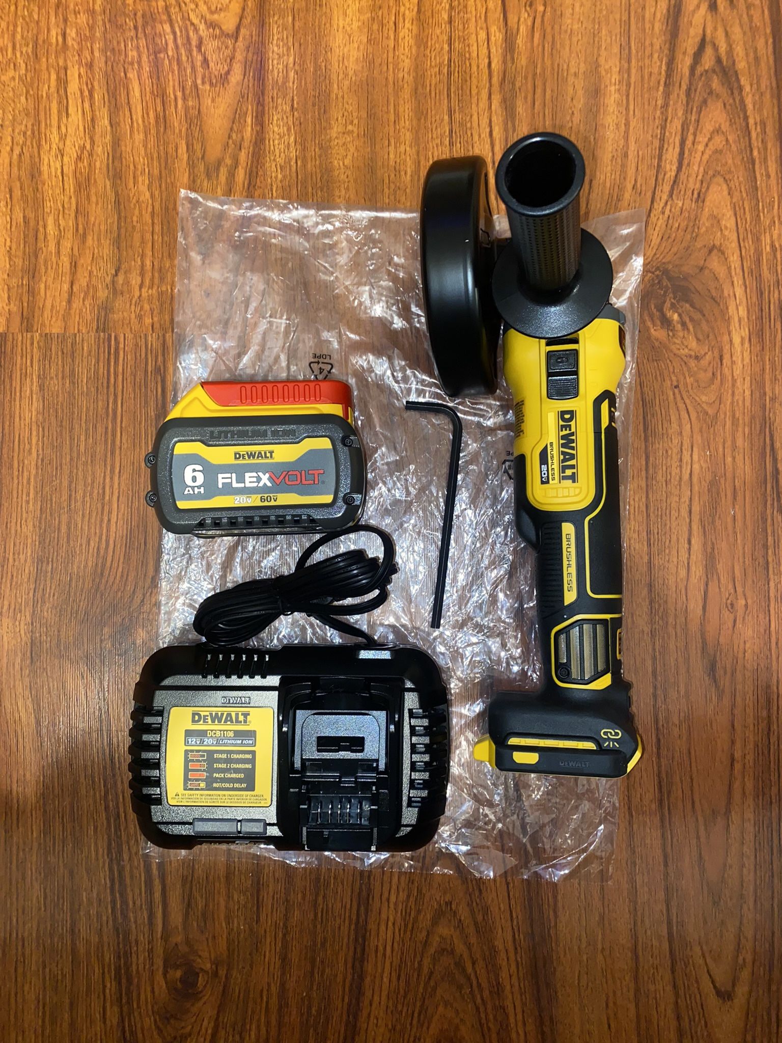 (1)New 6 Speed Dewalt Brushless Flexvolt Advantage 5” Angle Grinder RPM 3,000-9,000 (DCG409VS) (1) 6.0 Ah 20V/60V Flexvolt battery (DCB606) (1) 12V/20V Charger