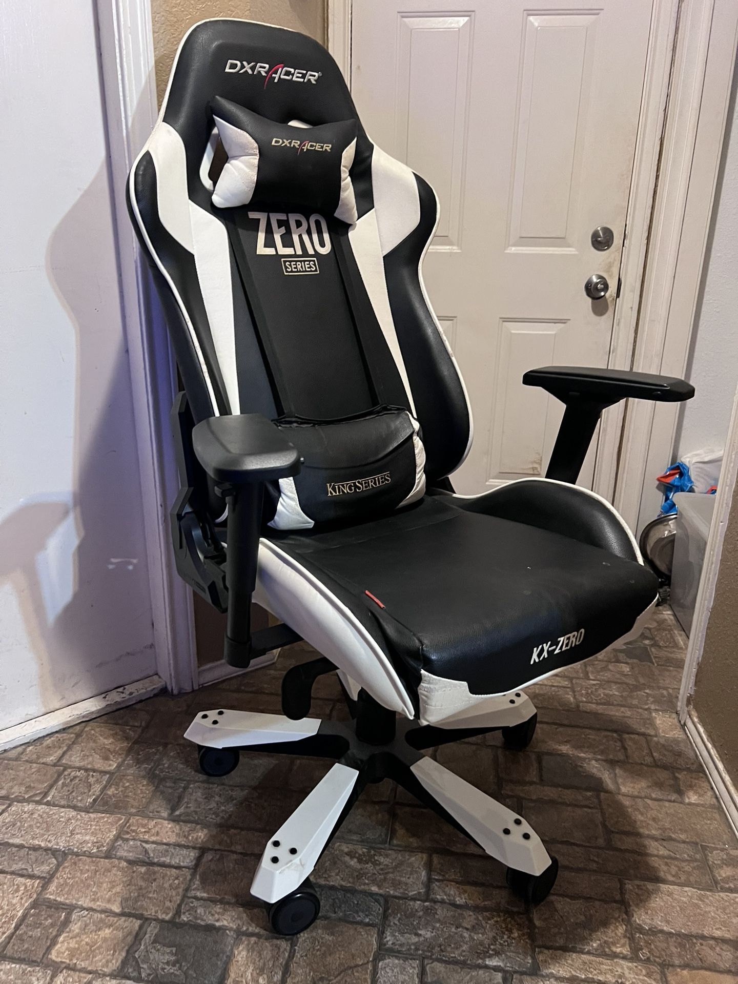 DxRacer Gaming Chair zero series King size. Used, had for 2 in years and went to a different chair. Don’t have a use for it anymore figured someone might. I accept: Cash, PayPal, Cash app, Venmo, Apple Cash Here’s the technical specifications from the DXRacer Website: Style Name : King Series Zero Chair Type : Gaming Chair Foam Type : High Density Mould Shaping Foam Foam Density : 54 kg/m³ Frame Color : Black Frame Construction : Metal Chair Cover Color : Black and white Chair Cover Material : Carbon Look Vinyl+PU Adjustable Armrests : 4D (SP/0131/N) Armrest Pad Size : 10.6"L x 3.9"W Mechanism Type : Multi-functional Tilt (SP/0207/N) Adjustable Tilt Angle : 1~14° (SP/0207/N) Tilt Lock : Yes Tilt Angle Lock : Yes Gas Lift Specification : 100/60 (SP/0311/N) Gas Lift Class : 4 Chair/Seat Back Style : High-back Adjustable Back Angle : 135° Adjustable Lumbar Cushion: Yes Adjustable Headrest : Yes Base Type : 5-star Wide Aluminum Base (SP/0405/N) Caster Size & Material : 3" Caster/PU (SP/0704/N) Assembly Required : No Seat Size : 16"W(Front) x 14.5"W (Back) x 19"D Maximum Seat Height : 24" Minimum Seat Height : 20" Maximum Arm Height : 33" Minimum Arm Height : 26" Backrest Height : 33.25" Backrest Shoulder Width : 24" Weight Capacity : <300 lbs / 136.1 kg Recommended Weight : 275 lbs / 124.74 kg