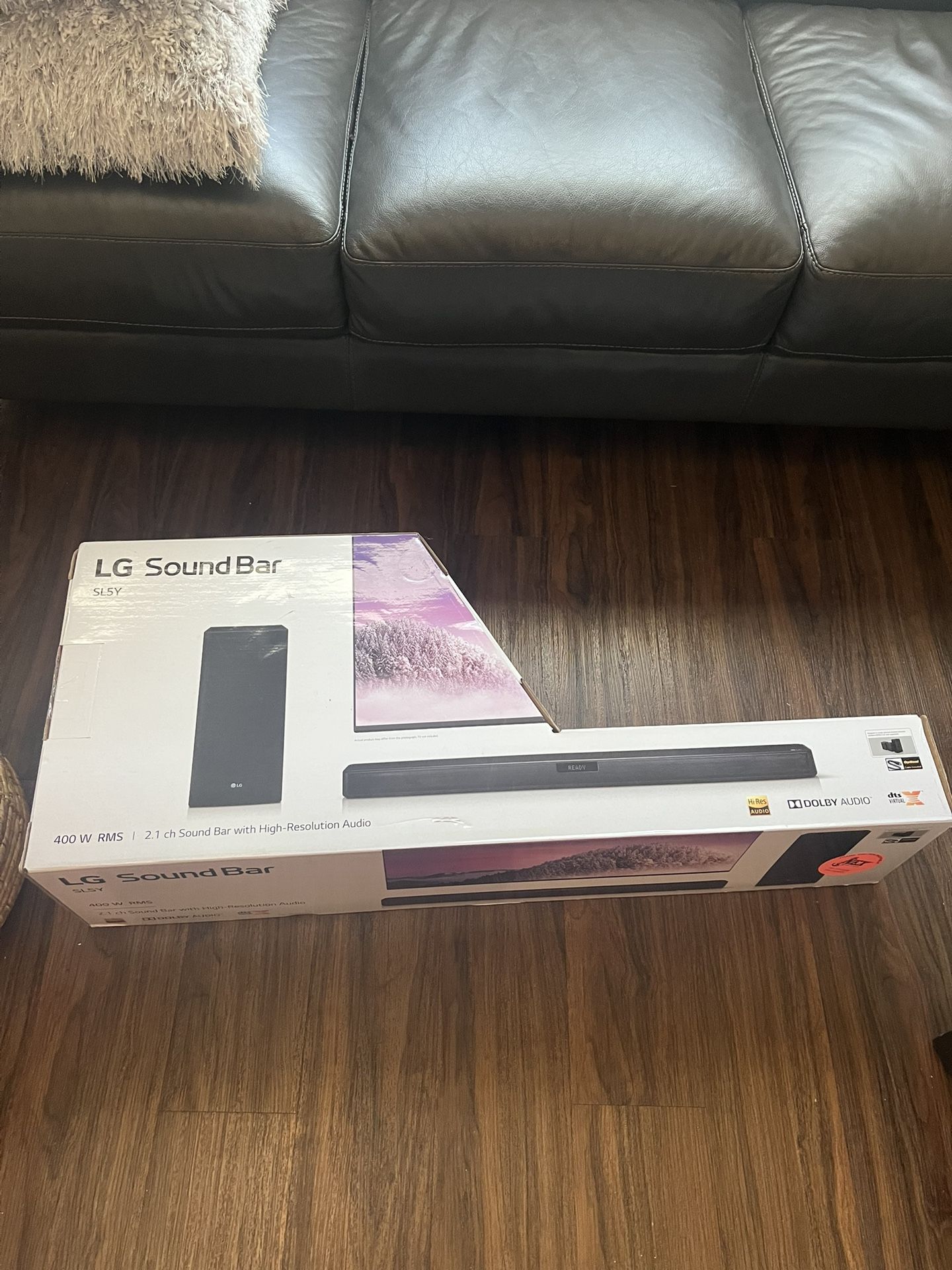 Brand new, never used LG SL5Y sound bar. See information on pictures. This sound bar has been in the box and unopened for four years. It’s been in my apartment, protected from sun, heat, water, pets, mishandling and smoke. 400 watts 2.1 channel High resolution audio Dolby audio Wireless surround sound