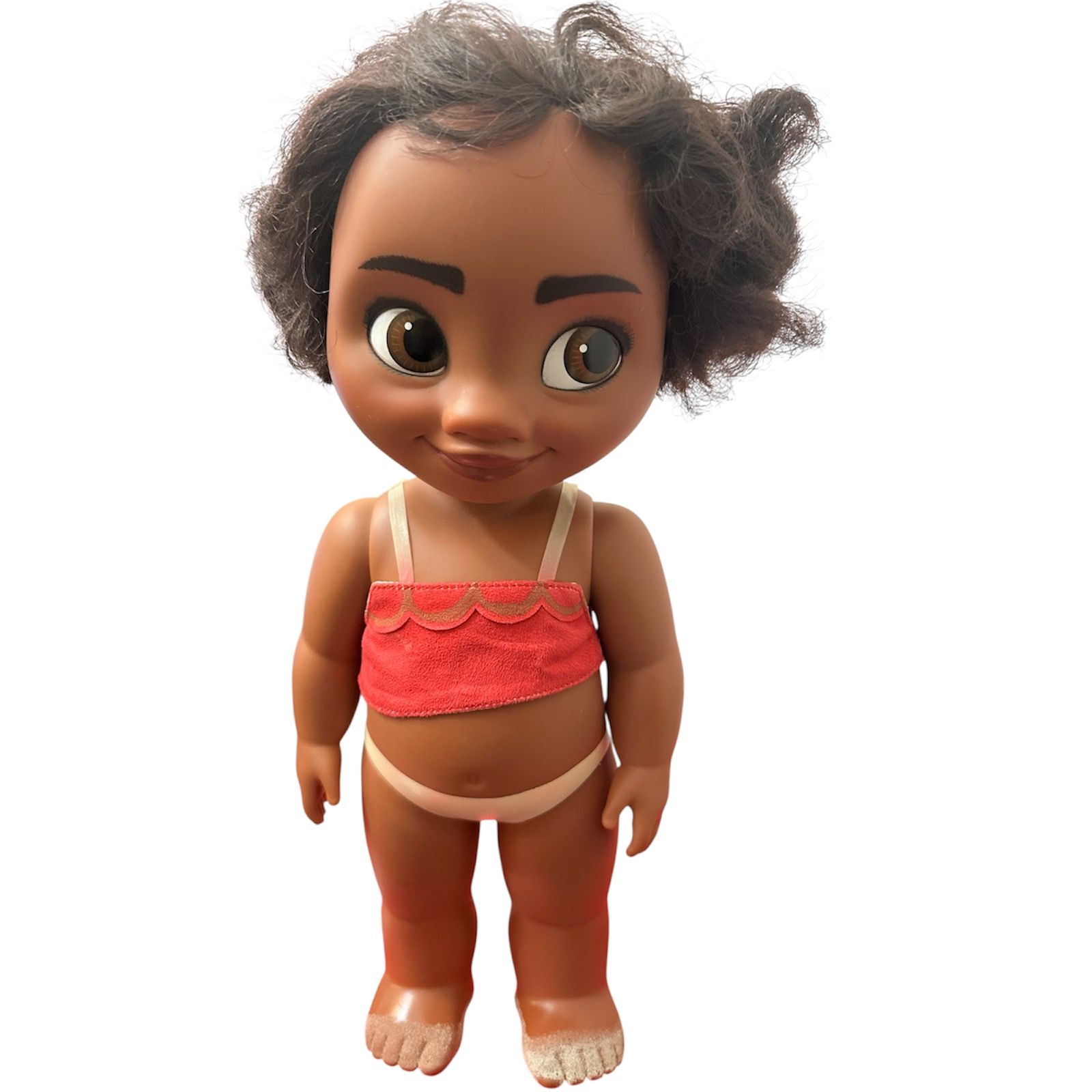 Features • Disney Animators Collection style Moana toddler doll • Approx. 15” tall • Posable head, arms, and legs • Rooted textured hair • Sandy texture on feet (shown in photos) • Great as replacement doll or for display • Marked © Disney Description Pre-owned Disney Animators style Moana toddler doll in good used condition. Doll shows normal play wear including light scuffs/marks on body and arms. Hair is full but slightly frizzy and may need restyling. Sandy-textured feet visible (see close-up photos). No clothing or accessories included — doll only as shown. Please review all photos carefully for overall condition. Condition Used – Good with visible cosmetic wear from play. From IssyGotDeals — Shop Smart, Save BIG!
