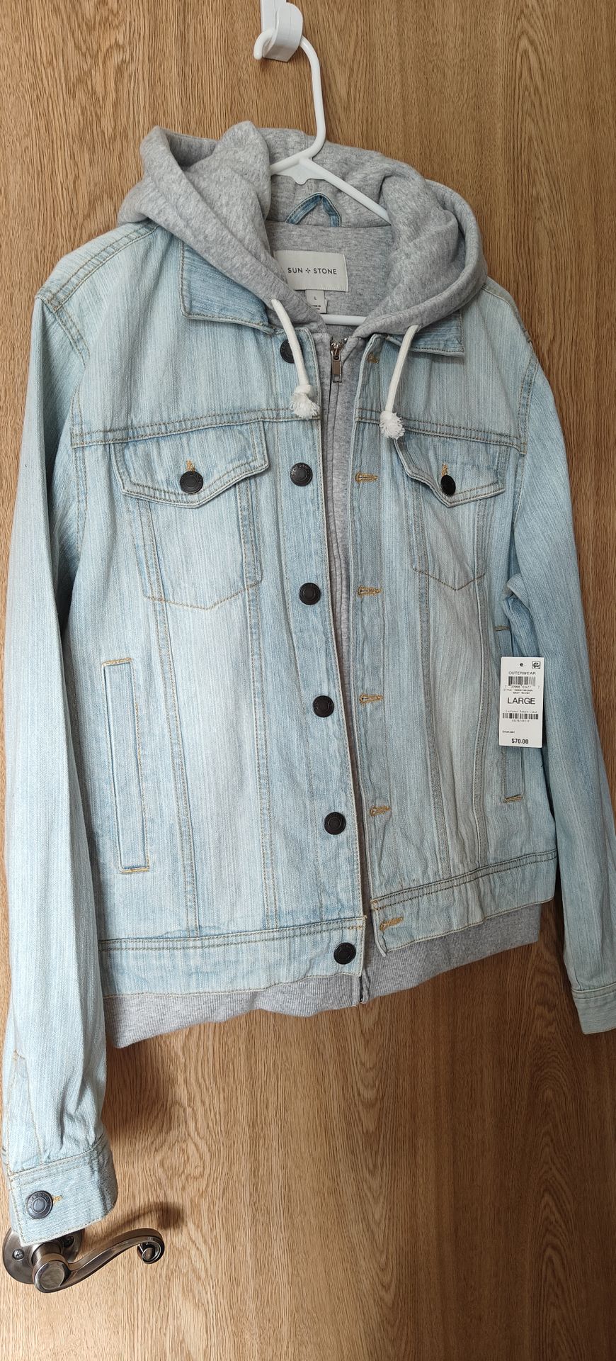 Sun and Stone, bought at Macy's. Jeans jacket, zip up hoodie