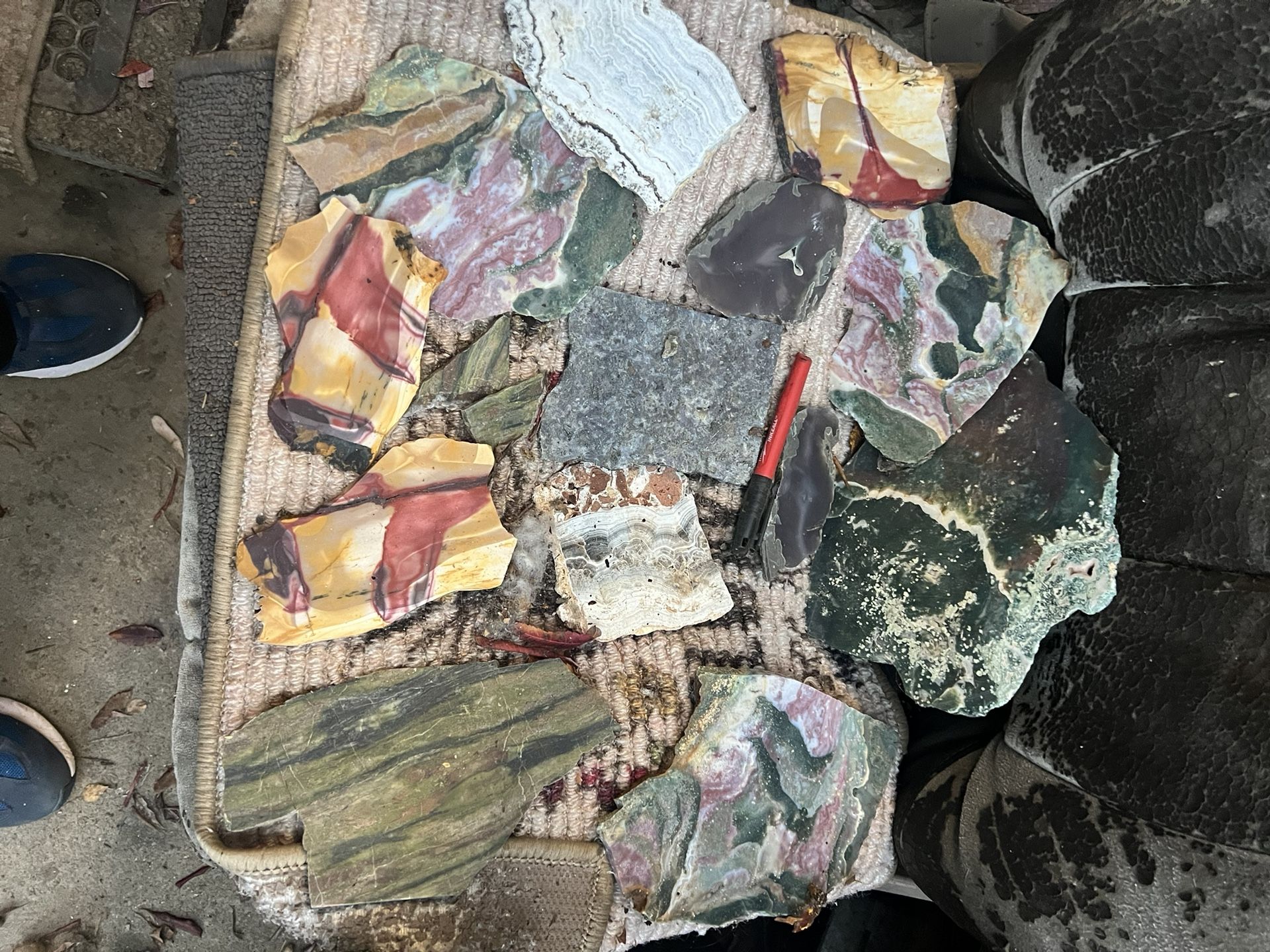 An assortment of lapidary slabs. Mookite, ocean Jasper assorted others. $100 for the batch. No picking and choosing. Sells as a lot.