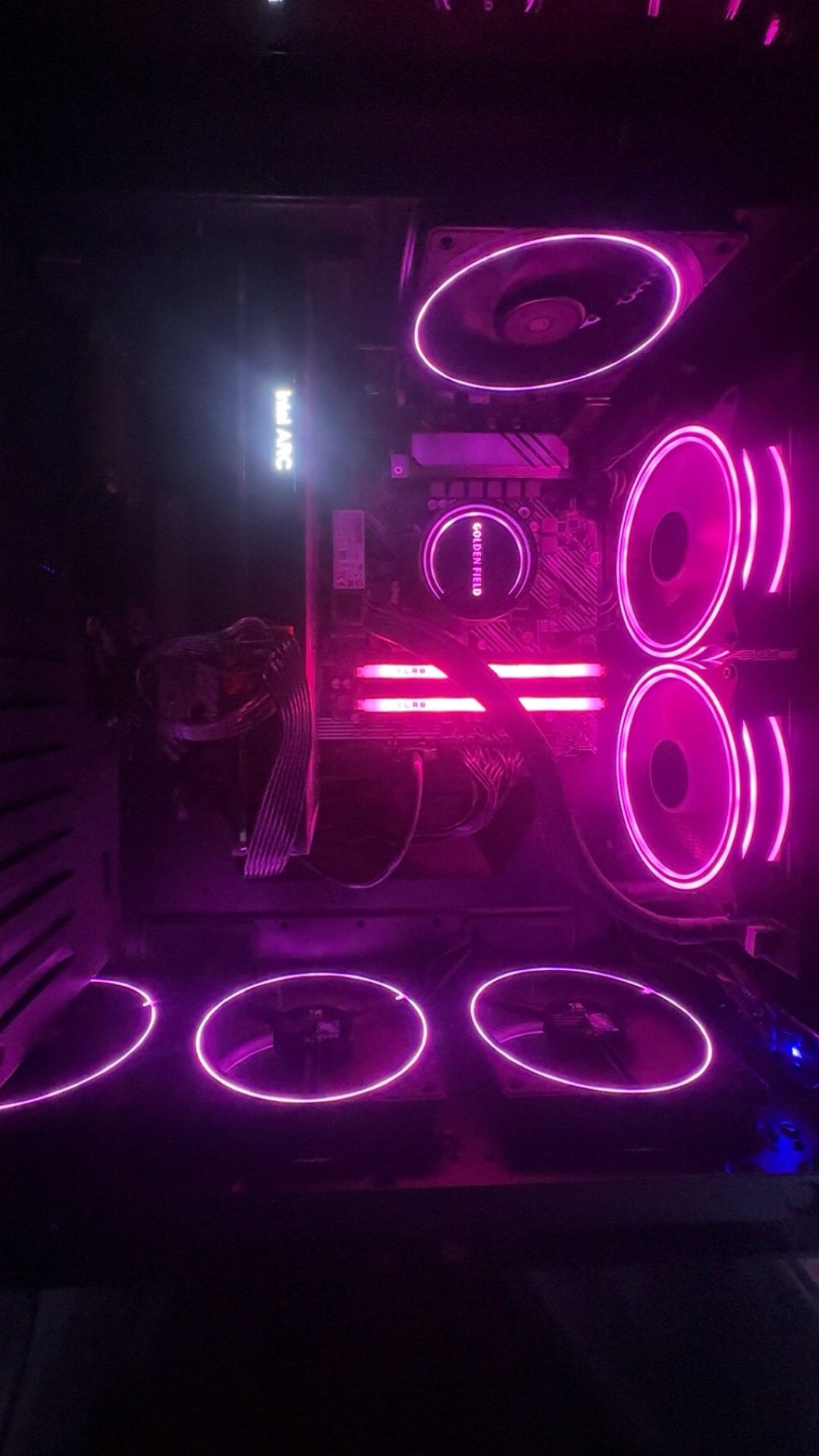 Bgears B-Voguish Mid Tower ATX case Asus Prime H470- Plus motherboard Intel i7-10700 Intel Arc A750 LE 8 Gb GDDR6 GoldenField Icey Chill 240G ARGB liquid Aio 32 Gb PNY XLR8 DDR4 @3600mhz ThermalTake 750w ARGB fully modular 80+ Gold rated PSU 512 Gb SK Hynix SC300 m.2 Sata ssd WDPurple 12Tb HDD @7200 RPM for game storage 4 ThermalRight Halo ARGB 120mm case fans TPLink ACE5400 WiFi 6e WiFi and Bluetooth PCle adapter