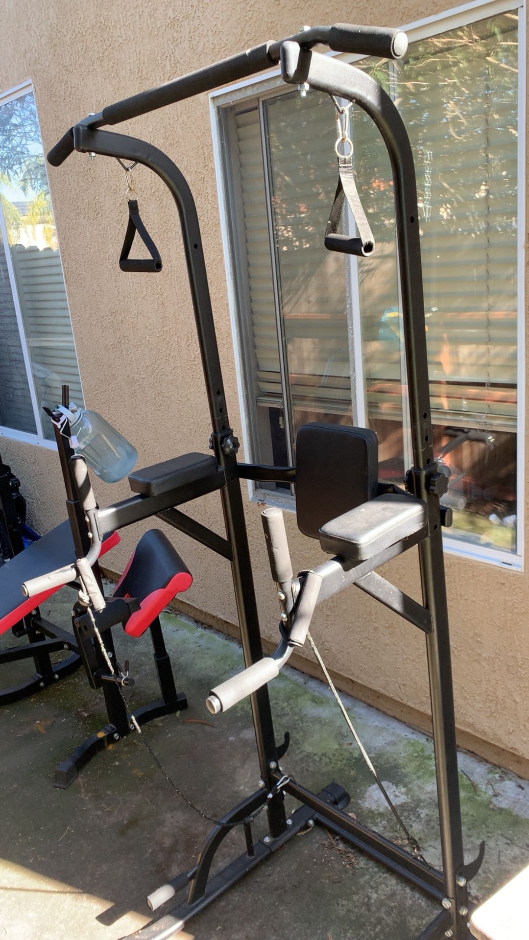 Vevor brand weight set. Only had for 3 months. Could use a small wipe down. Pretty much new. Pull-up bar station near mint. Olympic weights 200lb. Good start for a home gym. 315 or best offer