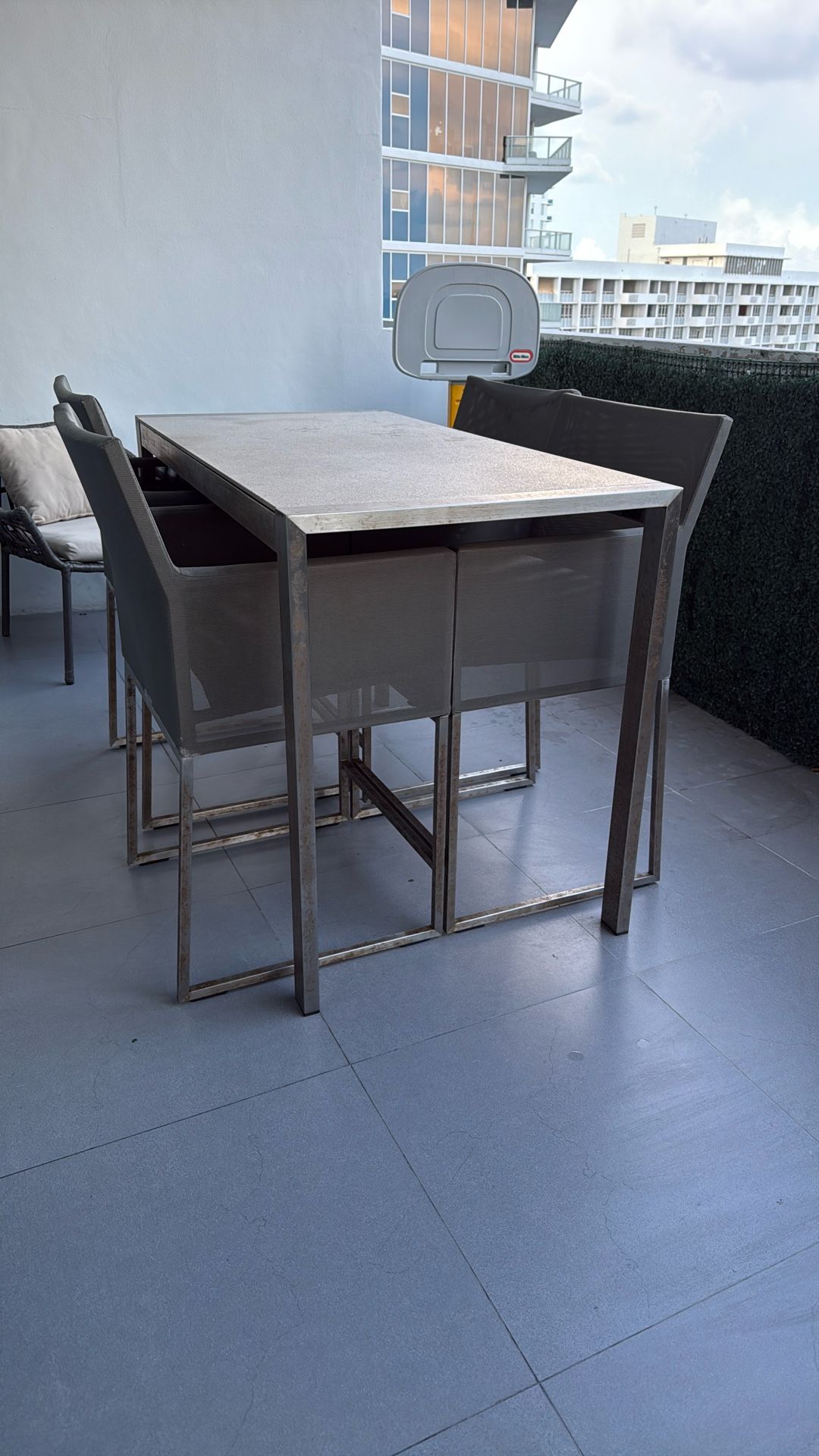 Beautiful modern dining table with chairs. - Tables and chairs need restauración. Cushion fabric resistant to heat and water. Table Measures: Height: Measurement 3′ 2″ (38″, 96 cm) Width: Measurement 27½″ (2′ 4″, 70 cm) Length: Measurement 4′ 7″ (55″, 1.41 m)
