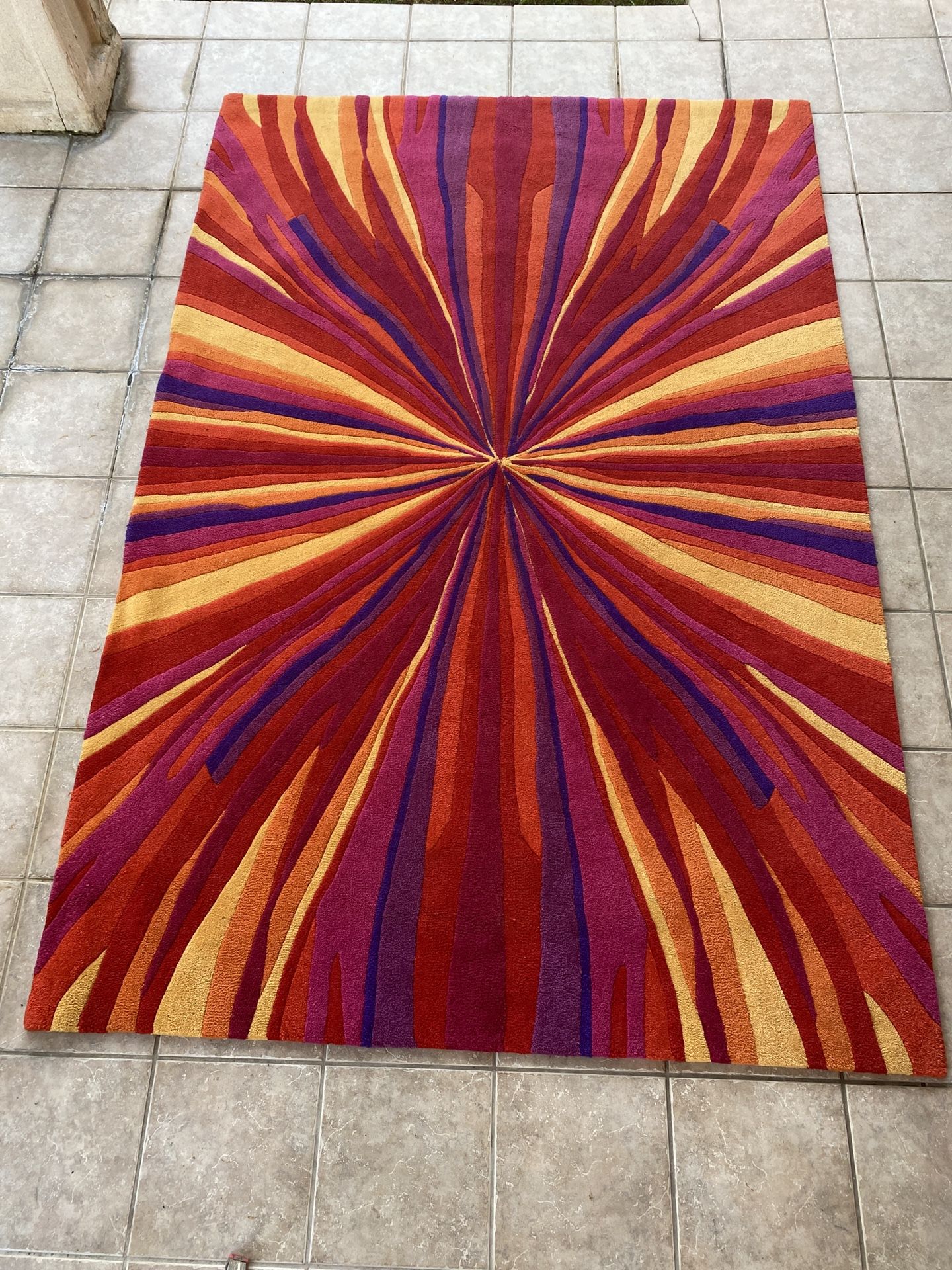 This carpet is 100 percent virgin wool and was manufactured in Hong Kong in 1976. The pattern is called Sunburst for obvious reasons. The vivid color scheme is symmetrical from the center to each of the four sides and from the center of each side to the left and right. Note the depth of the pile is approximately 5/8 inch. For 20 years it was displayed in a wall mounted frame with no direct sunlight. After that it resided beneath a parlor grand piano to acoustically soften the sound of the piano. And again no direct sunlight exposure. It has never been out for general traffic. It is 6 ft x 9 ft. If you need a striking accent carpet, this is it.