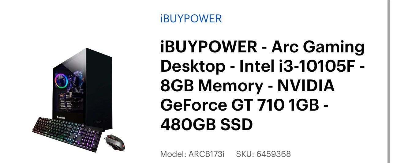 Ibuy power arc gaming desktop intel i3-10105F-8GB memory Nvidia GeForce GT710-1GB 480GN SSD including mouse and keyboard. Used and originally purchased in 2021
