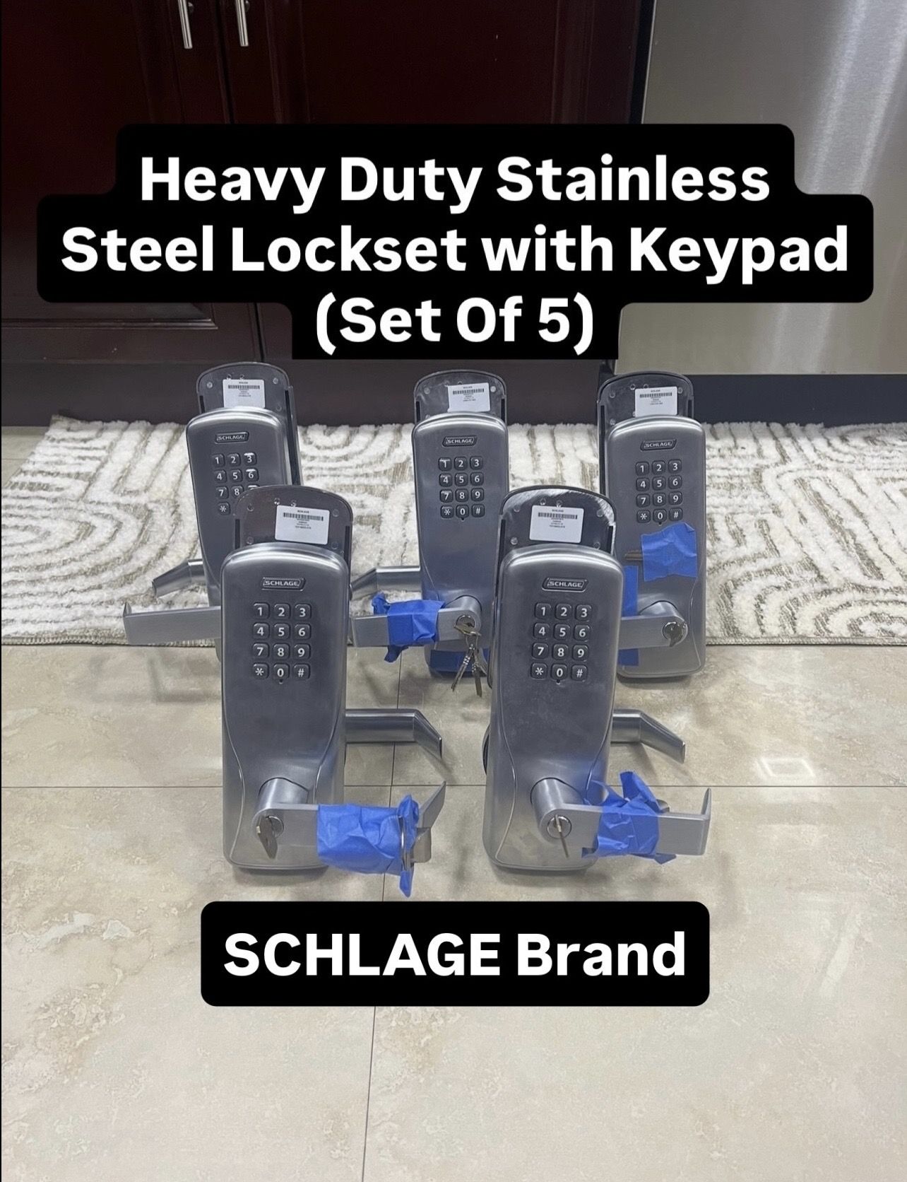 •THEY ALL WORK 100% •Selling all (5) lockset’s altogether for $950 •These are in perfect condition (No Boxes) •They “each” originally costs $880 with taxes, so in total there’s worth over $4,400 here. We’re selling all (5) lockset’s altogether extremely cheap in price, they’re no longer needed anymore and just need them gone. So most importantly take advantage of this amazing deal that you can’t find out there! You’re saving way over half off in price. •Brand: SCHLAGE •They each come with the keys and their codes •They also have batteries in each lockset (4 AA Batteries) in each lockset •These are each Stainless Steel •These each have their door latch taped to the handles, in case you want to use those latches •On the blue tape, each of their codes are written on there •SELLING AS IS! NO RETURNS/REFUNDS! Once you pickup the item in person, It’s in your hands. •PickUp Only! No Deliveries •I accept Cash and Zelle for payment •Located area in Hialeah Gardens FL 33018