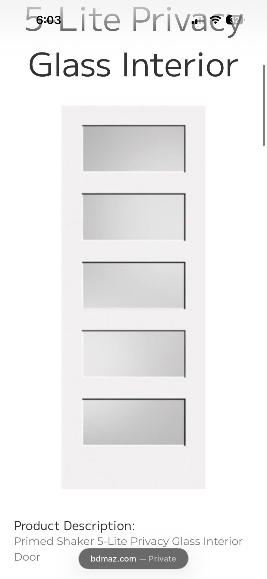 Purchased a Primed Shaker 5 lite Privacy Glass Interior Door from Baseboards and More- unfortunately does not fit our entry way. Your gain is my lose as i could not return it. Details are in the provided pictures. Purchased brand new $376. Asking $300 OBO. Single prehung door, 32” wide, 80” high, right hand inward swing.