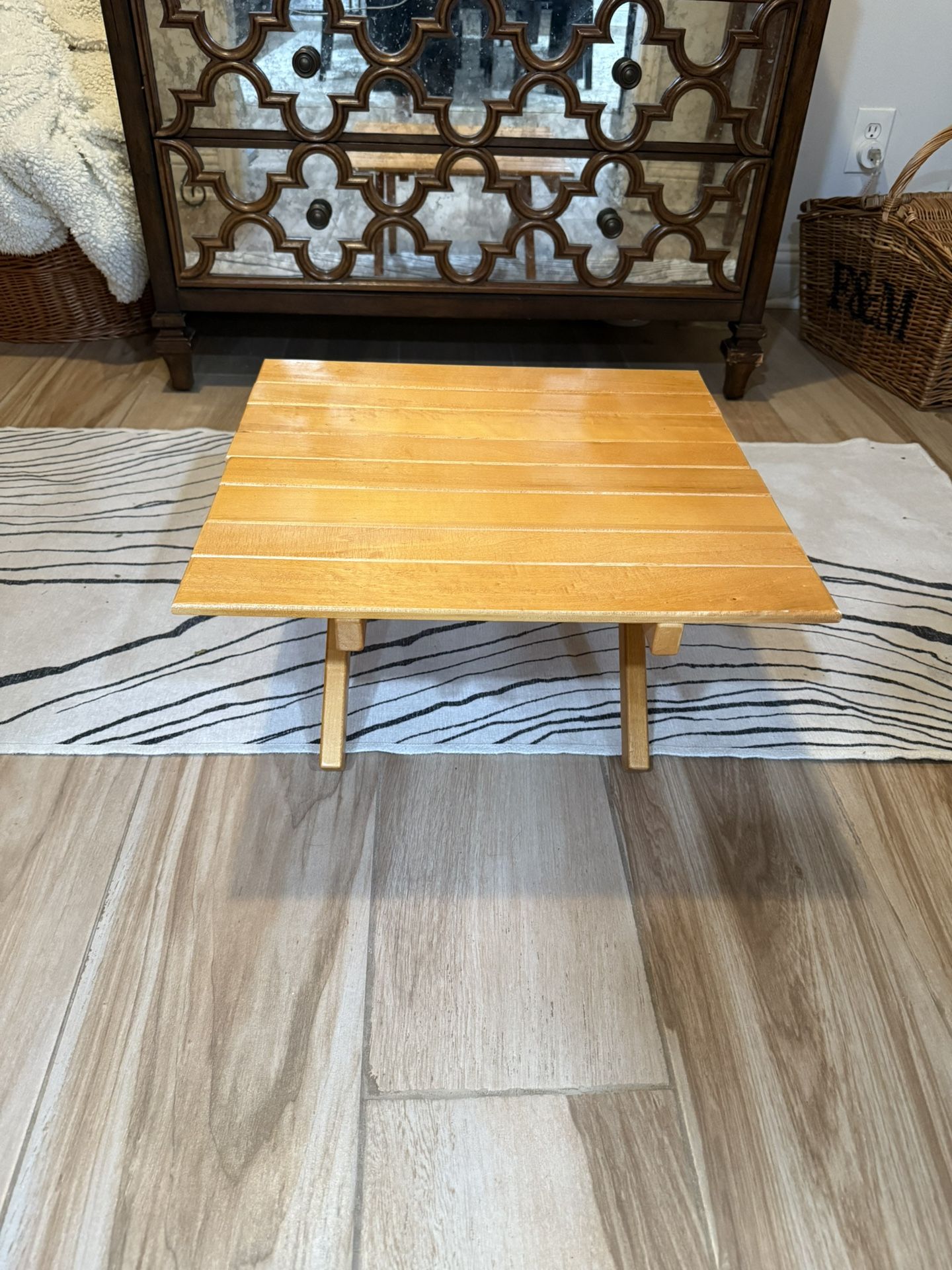 Foldable wooden picnic table. Easy to carry and light weight. Description from maker: Just The Right Height - At 10 inches in height and a table top measuring 20"x18.5, Short Table is just the right height to hold your drinks, snacks, picnic or camping materials, and any indoor event where a low floor table is needed All-Purpose Table - Short in stature, tall in possibilities; For indoor or outdoor use, short table is built to meet your needs for your camping trip, patio, picnic, desk, floor, bed tray or kids play table Simple Setup - Absolutely no tools or equipment needed to assemble; Easily fold open, store away, and portable to move Durable and Sturdy - Built to withstand conditions outdoors and stand sturdy indoors; At 5.5 lbs it will hold its weight; Crafted With 100% Wood - Invented and crafted by a talented woodworker; After years of plowing through boards to find just the right straight clear grain wood, the all-wood Short Table came to life. An original, slatted, premium top for that top of the line picnic table feel.