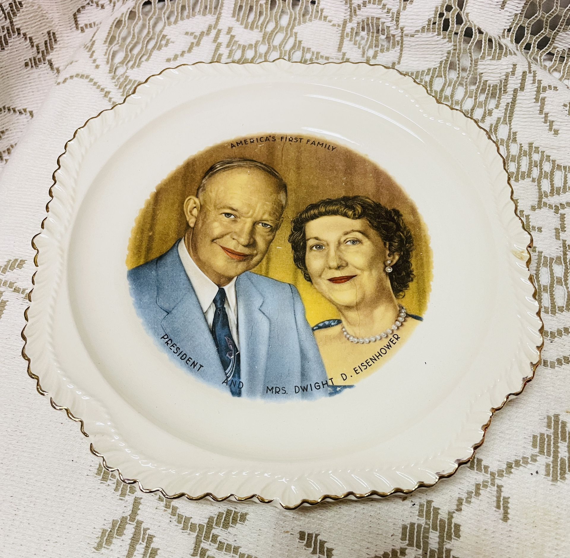 This is a vintage collectible porcelain plate featuring President Dwight D. Eisenhower and his wife, Mamie Eisenhower. The plate is a piece of political Americana from the 1950s, likely produced during his presidency (1(contact info removed)).