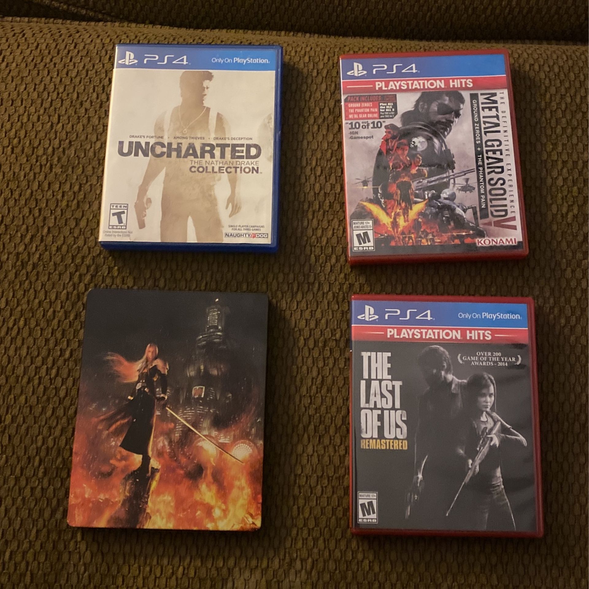 All games are in great and play well. For PS4/PS5 Games include: -Uncharted the Nathan Drake collection ($10) -Metal gear solid V the definitive experience ($20) -Final fantasy 7 remake steelbook ($35) -the last of us remastered ($15) Or everything for $60