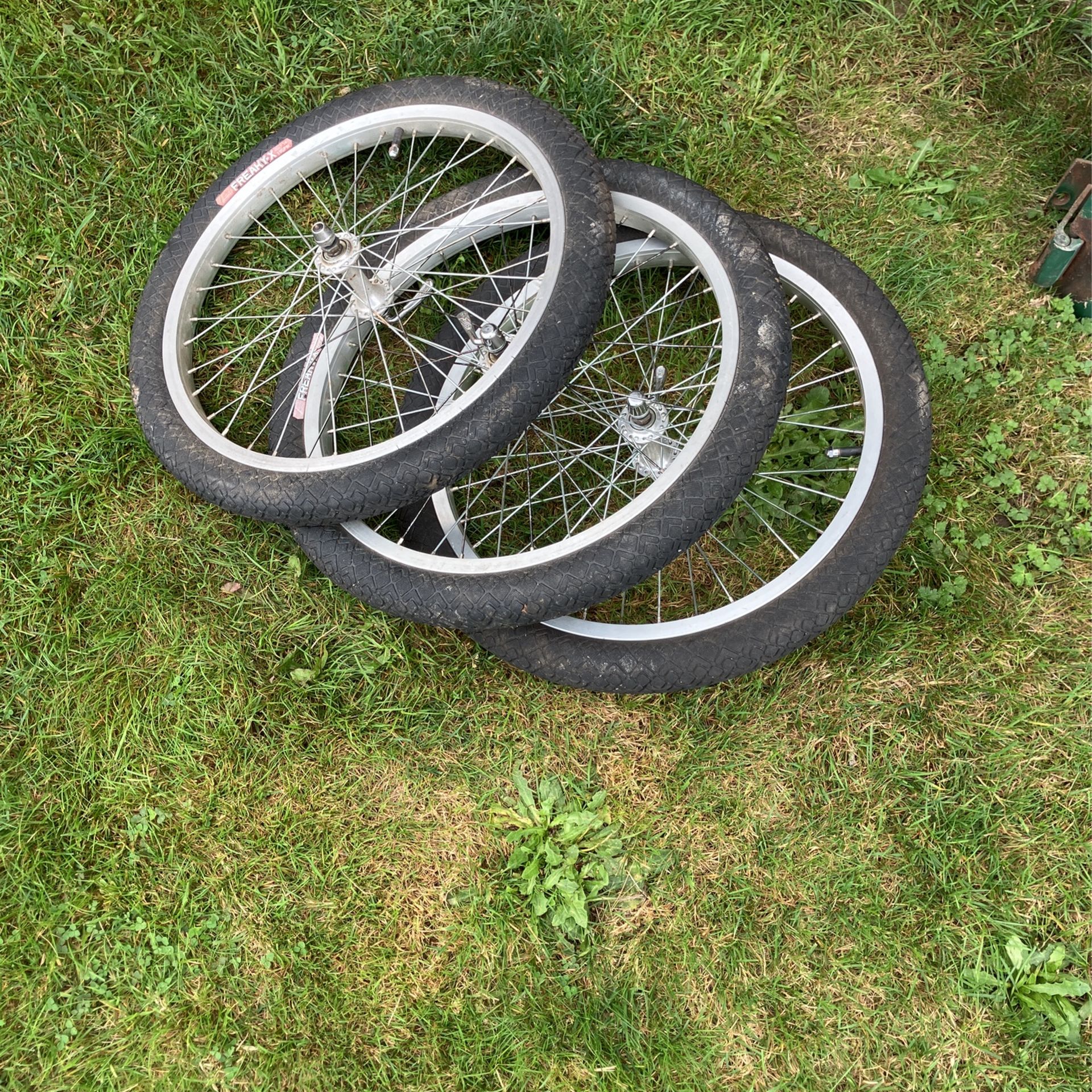 Have three runners baby stroller wheels/tires in Great conditions with No issues at all. Easy removal with hand spindle nuts. Tires hold air properly and almost new condition. Ask questions if needed. ($35 for the set of three. Also will work on kids bikes) -JUST tires/wheels-