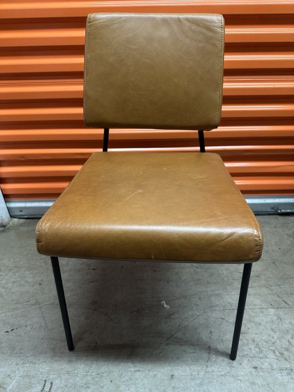 WEST ELM Wire Frame Leather Dining Chair. Saddle Leather, Nut Padded comfort A thick cushioned seat delivers stylish comfort for your kitchen or dining area. ***FLOOR MODEL: FINAL SALE*** original price: $549 plus tax, sale price: $220 Overall: 17.6"w x 21.2"d x 31.9"h. Interior seat width:17". Seat depth:17.1". Seat height:18.6". Leg height:12.4". Weight capacity:275 lbs.