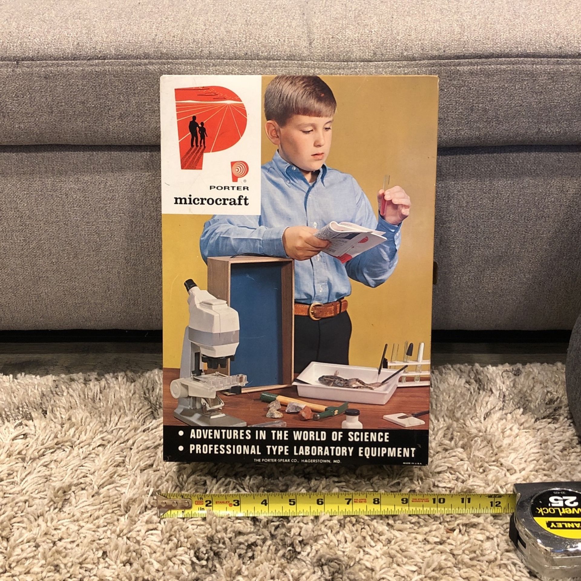 Very cool vintage metal box (1950-1960s) Brand is Porter Microcraft This is an empty box for a science set Will make a very cool wall-mounted cabinet or just as a box for your random stuff Dimension: 13.75” x 9.5” x 5” Made in USA