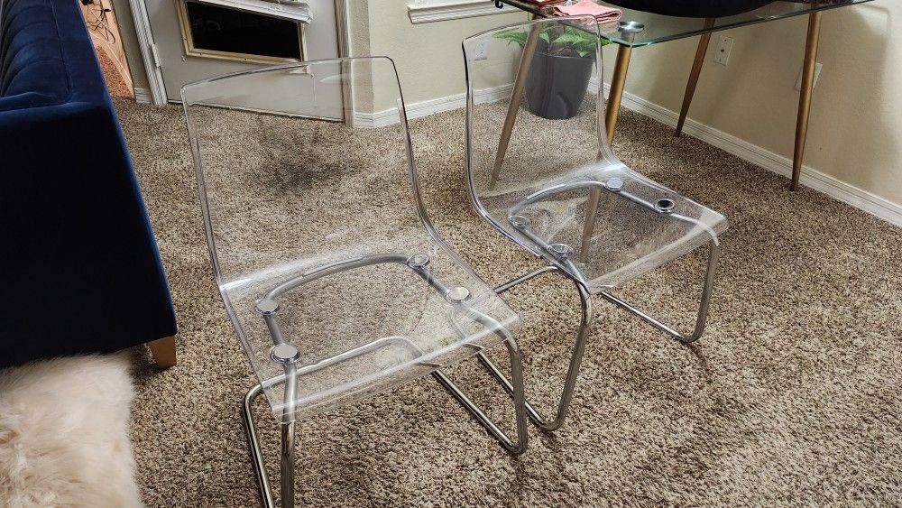 2 clear Ikea dining room chairs This is a deal. Ikea sells these chairs at $95 a piece. Measurements are in the photo No holds, no shipping, no transportation Barely used. Like new. Thanks for stopping by. Check out my other items π