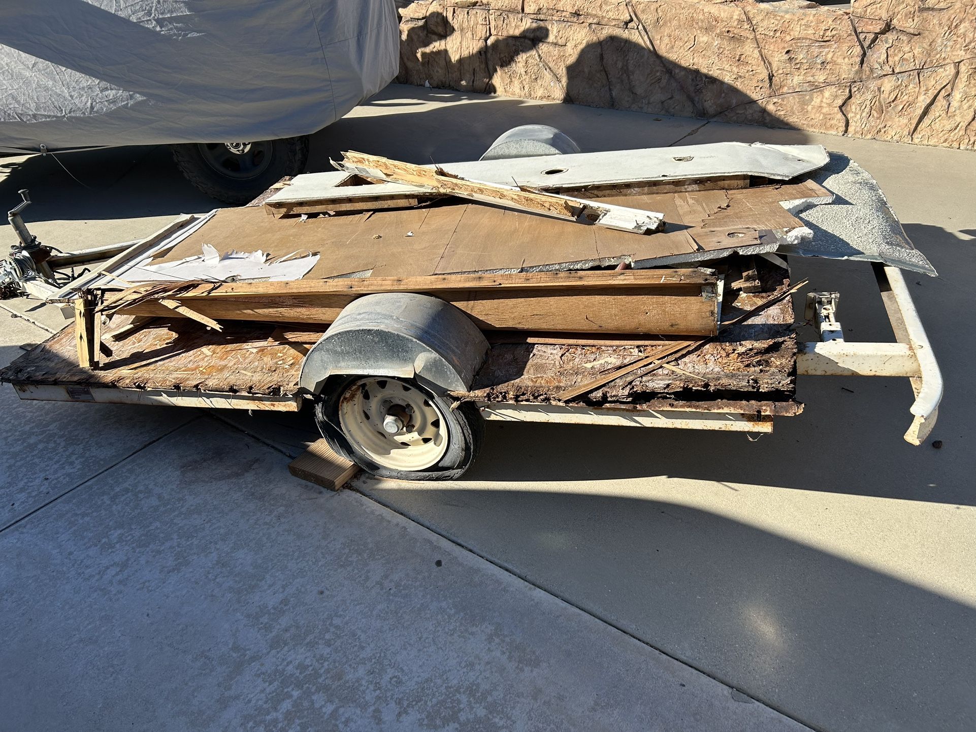 This was originally a StarCraft 19 pop up tent. I have removed 99% of the tent and only the floor boards an metal frame with flat tires remain. This could be built into a useful toy hauler or yard / trash trailer for hauling. I located the tires at Harbor Freight for $50. I don’t want to put any money into it. This would be a bill of sale only since the trailer has not been registered since about 2005. I am asking $100 dollars. You haul it away. 909 area code. I am located in Rialto. You can text or call me at (contact info removed). Daniel
