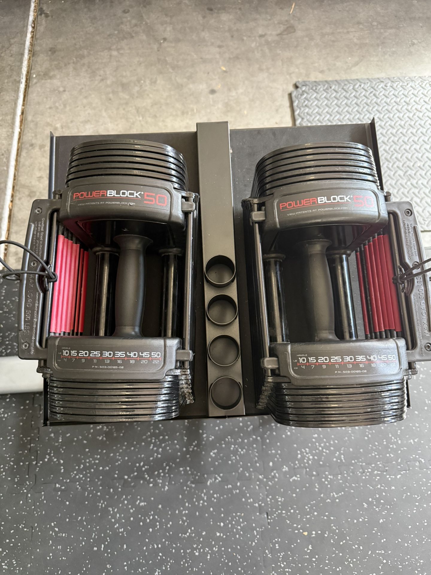 Excellent condition 10 to 50 pounds power block dumbbells. Dumbbells only does not come with rack.