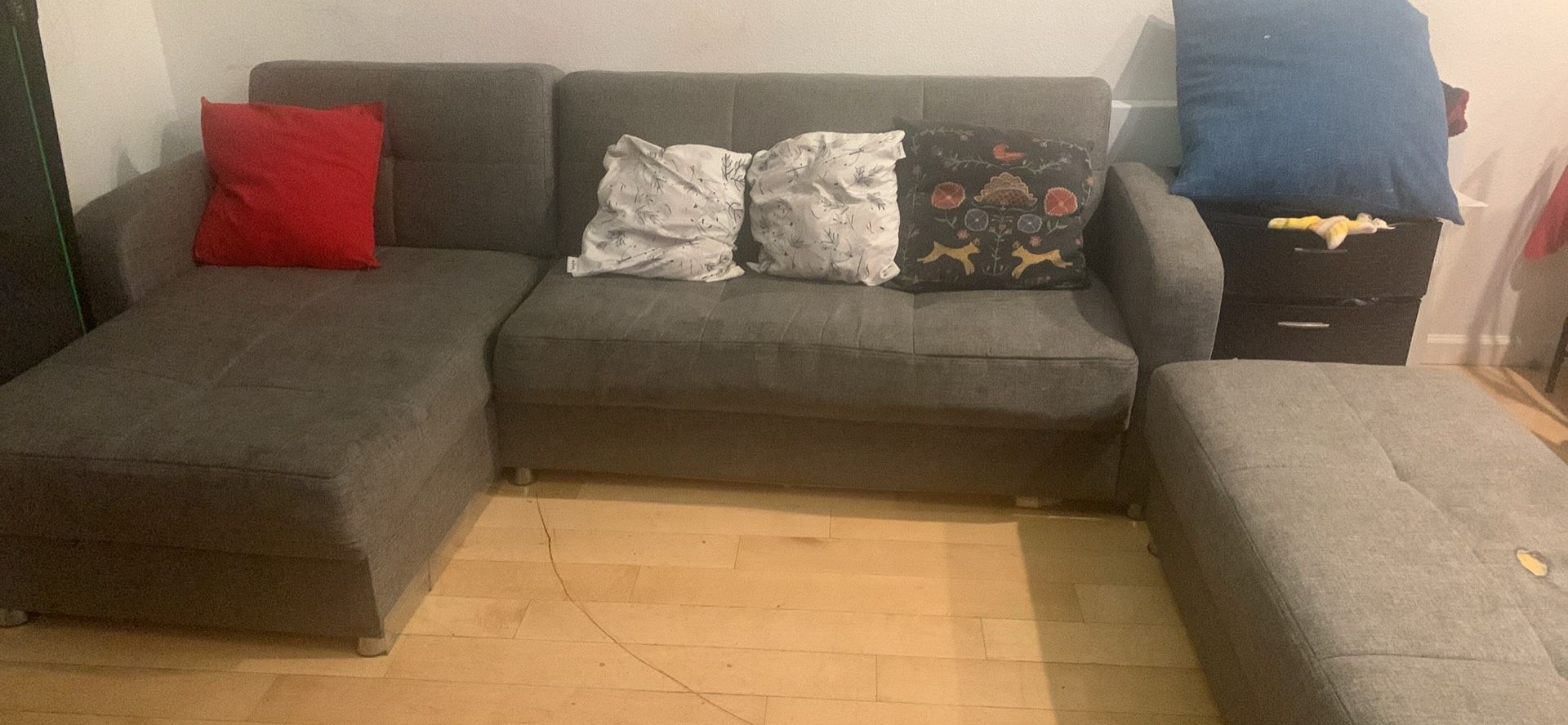 This is an L shaped couch cum bed with underneath storage and an ottoman. The ottoman has a little burnt cover. It just needs washing other wise in good condition.