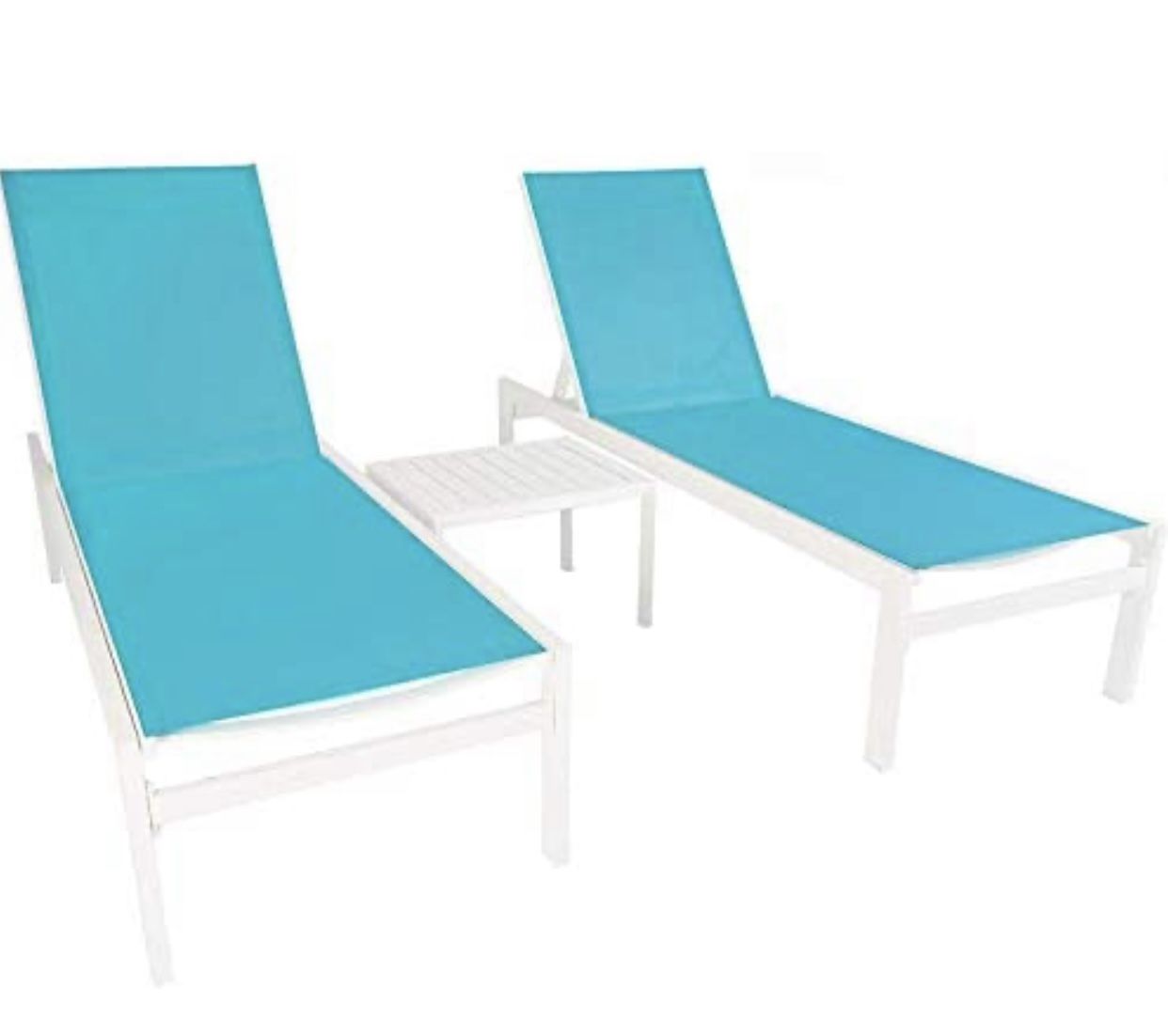 Kozyard Modern Full Flat Alumium Patio Reclinging Adustable Chaise Lounge with Sunbathing Textilence for All Weather, 5 Adjustable Position, Very Light, Anti-Rusty (2 Pack Blue w/Table