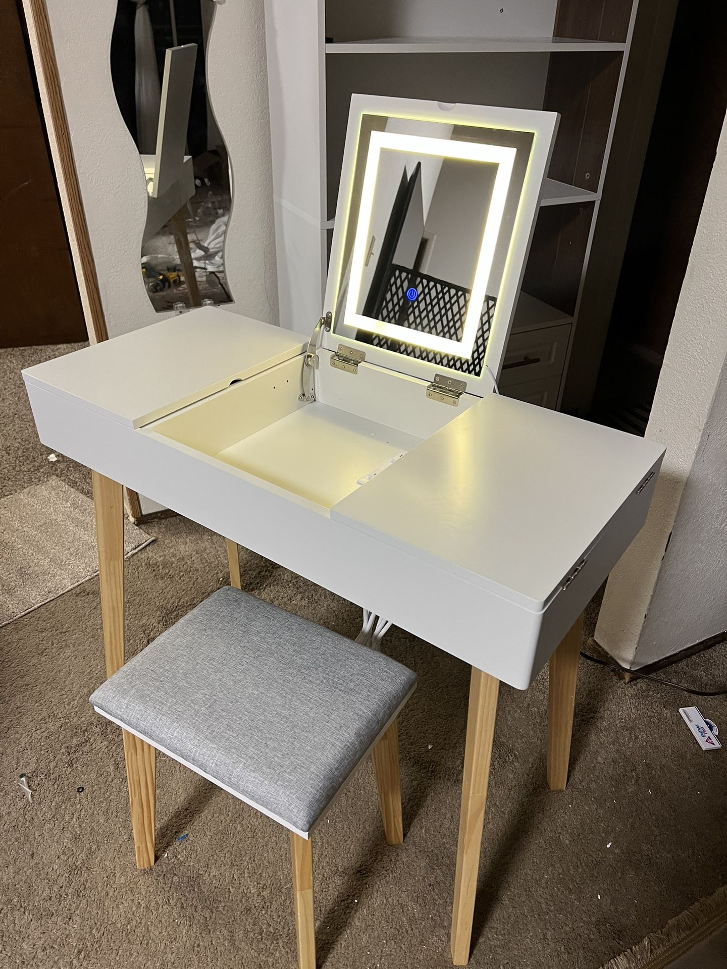 Vanity Desk with Flip-Top LED Lighted Mirror with chair