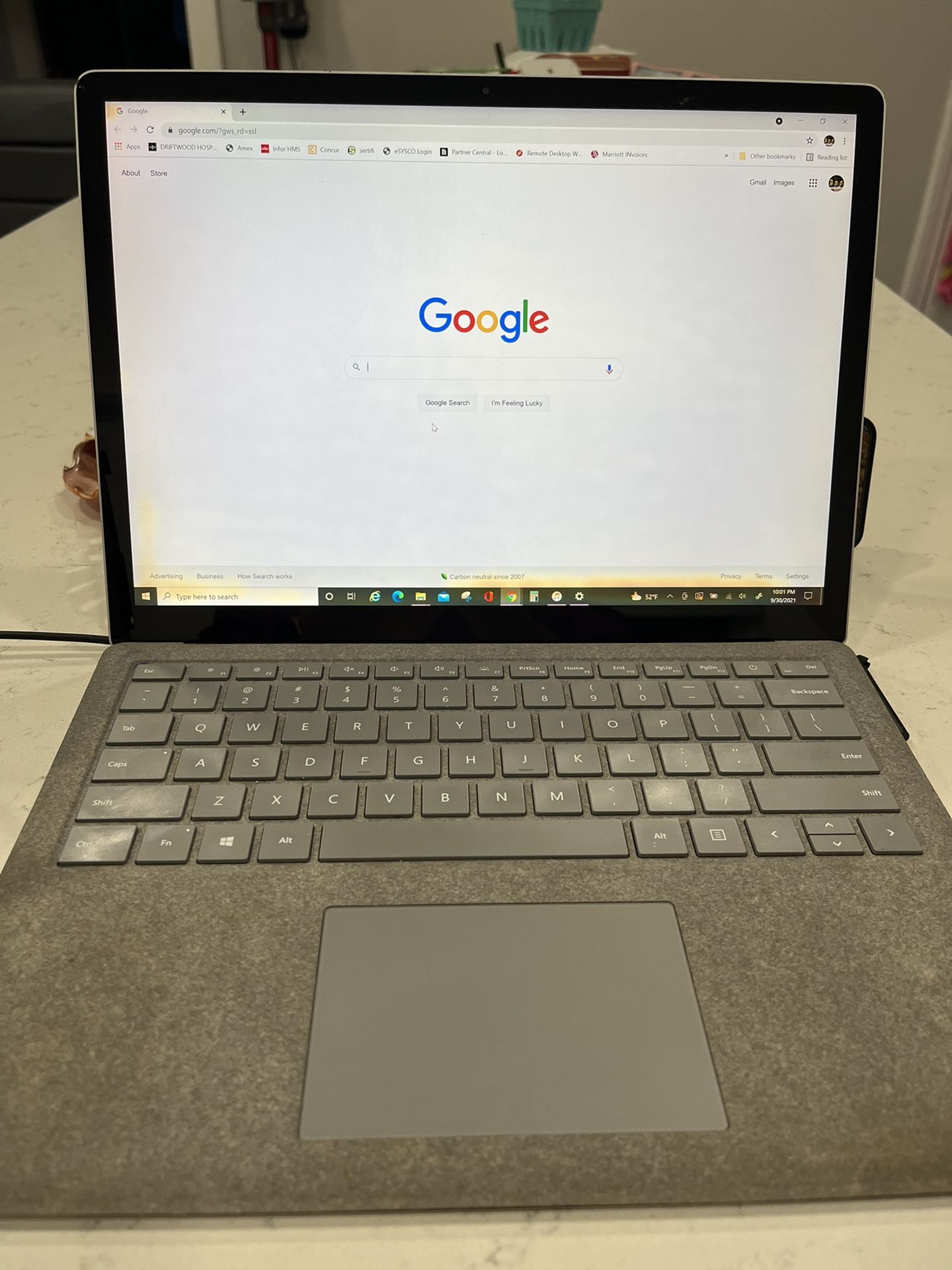 Slight discoloration on the side. Does not affect usage. Touch pad sensitive. I use an external mouse. Whole day battery.
