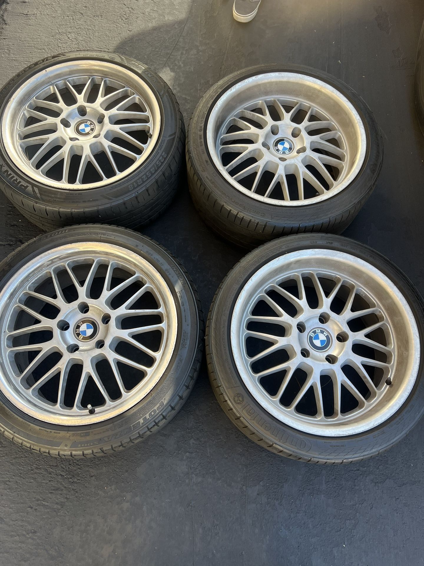 18” BMW rims I believe the are replica Beyern Mesh rims Tires have about 60% life left Fronts are 225/45R18 Backs are 255/35R18 Came off of a BMW e46 Rims themselves have scuff and scrapes 6/10 condition $500 firm.