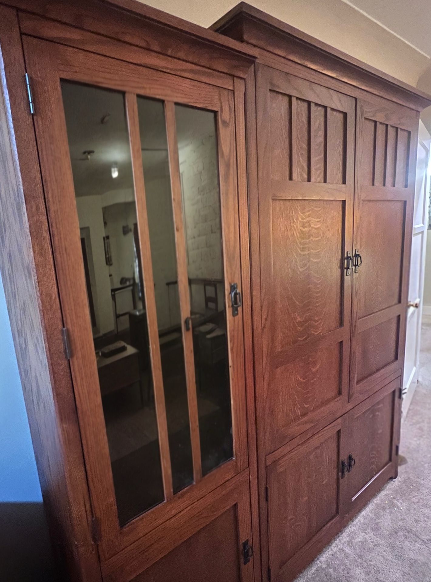 Gorgeous Mission-style cabinet and entertainment center in rich, warm wood with classic Craftsman lines. Features a glass-front display cabinet, multiple storage compartments, and solid, sturdy construction. This is a substantial, high-quality piece that adds warmth and character to any living room, dining room, or office. Dimensions: 5’11” W x 6’4” H x 17.5” D Clean and well cared for. Ready for its next home!
