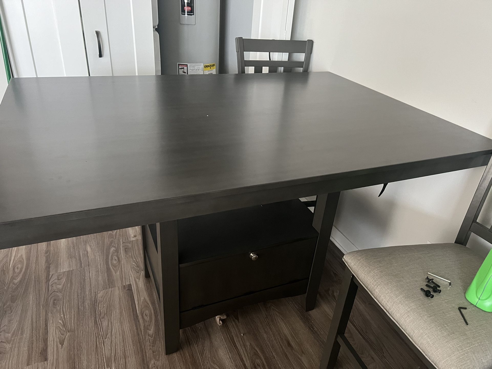 Used gray table with 4 chairs did not come with all bolts and screws. Some damage