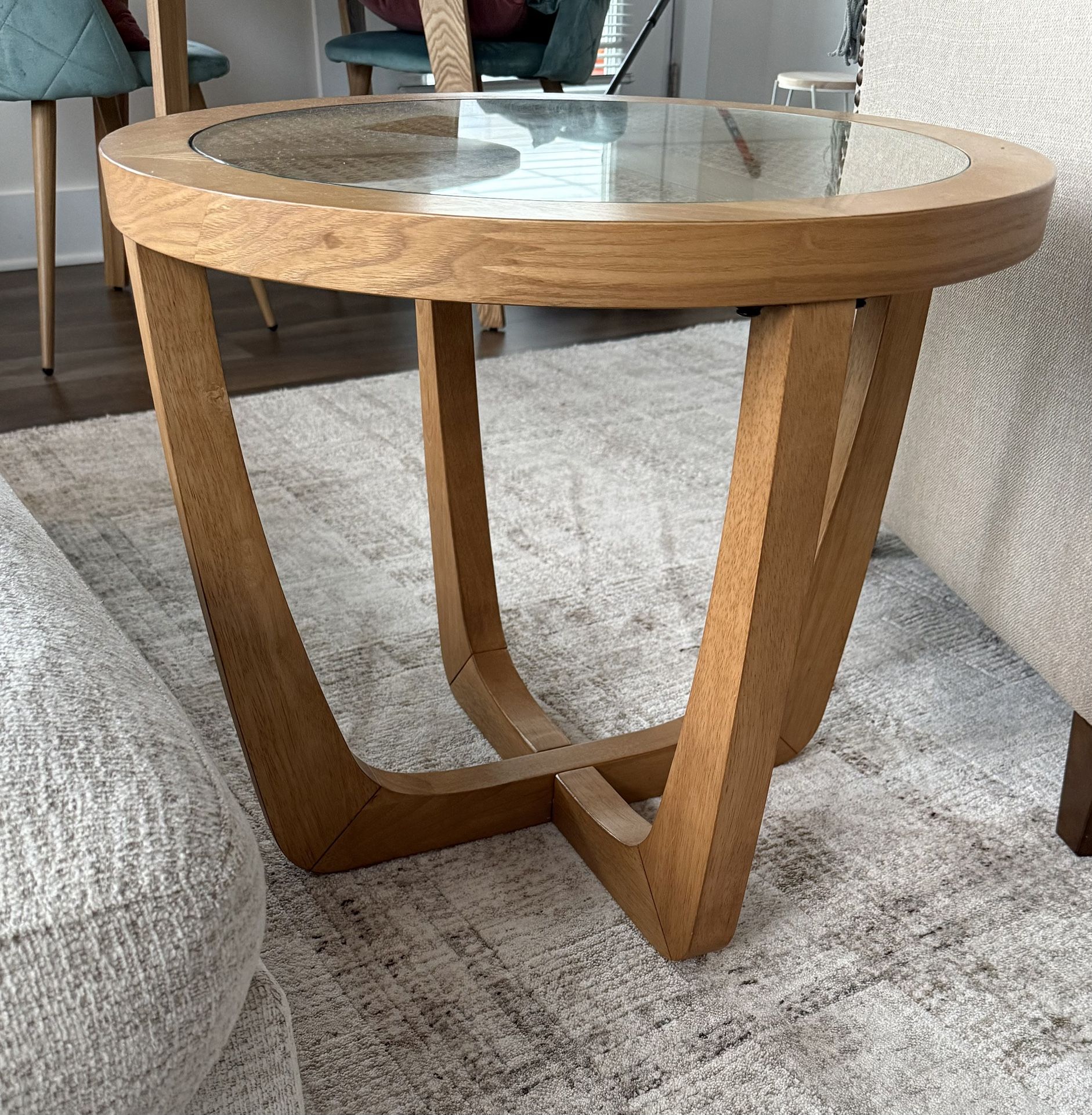 Beautiful Rattan & Glass Side Table with Solid Wood Frame by Drew Barrymore, Warm Honey Finish in great condition.
