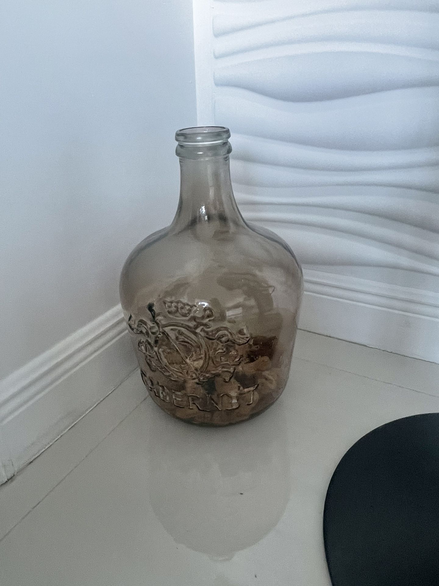 Beautiful decorative glass bottle with a vintage / rustic look. Made of thick smoked glass with embossed detailing, perfect as a statement decor piece. • Heavy glass construction • Smoked/amber tone • Embossed design on the front • Great for floor decor, corner styling, bar area, or shelf display • Can be used empty or styled with corks, stones, or lights Looks great in modern, rustic, industrial, or farmhouse-style interiors. Excellent condition.