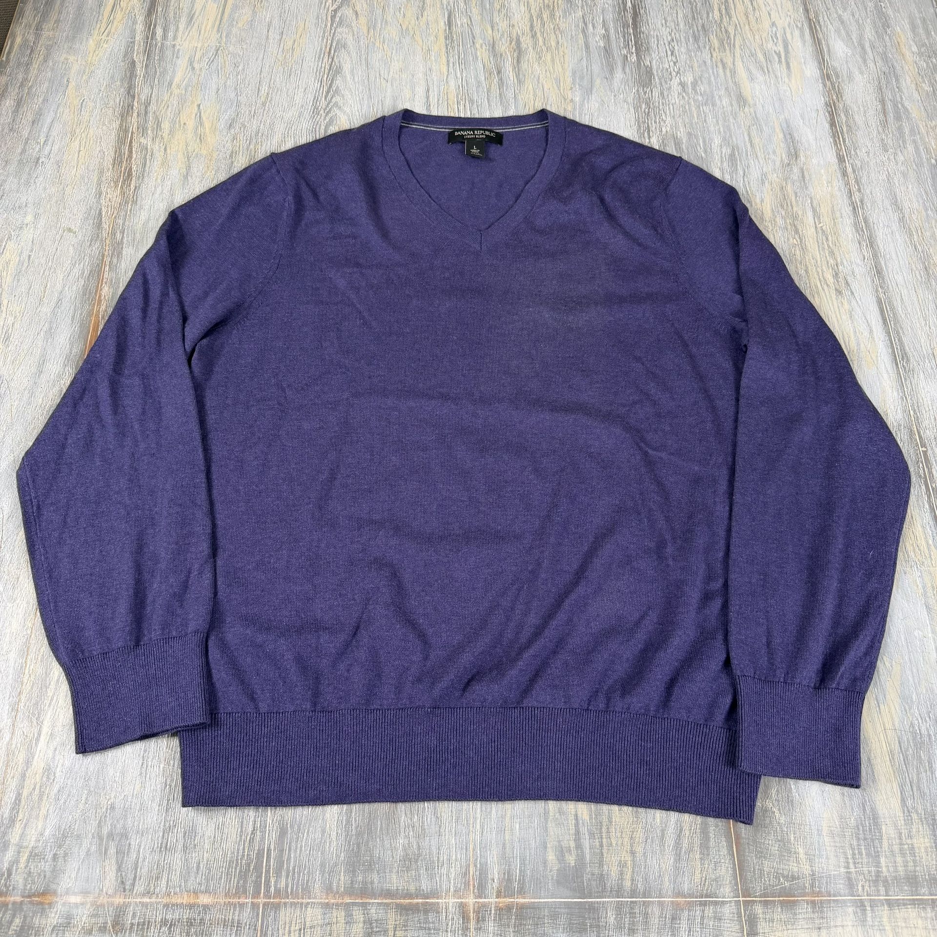 Banana Republic Luxury Blend Silk Cotton Cashmere V-Neck Sweater Lavender Mens Large. Used condition. 26.6” long by 21.5” pit to pit. Sold exactly as pictured.