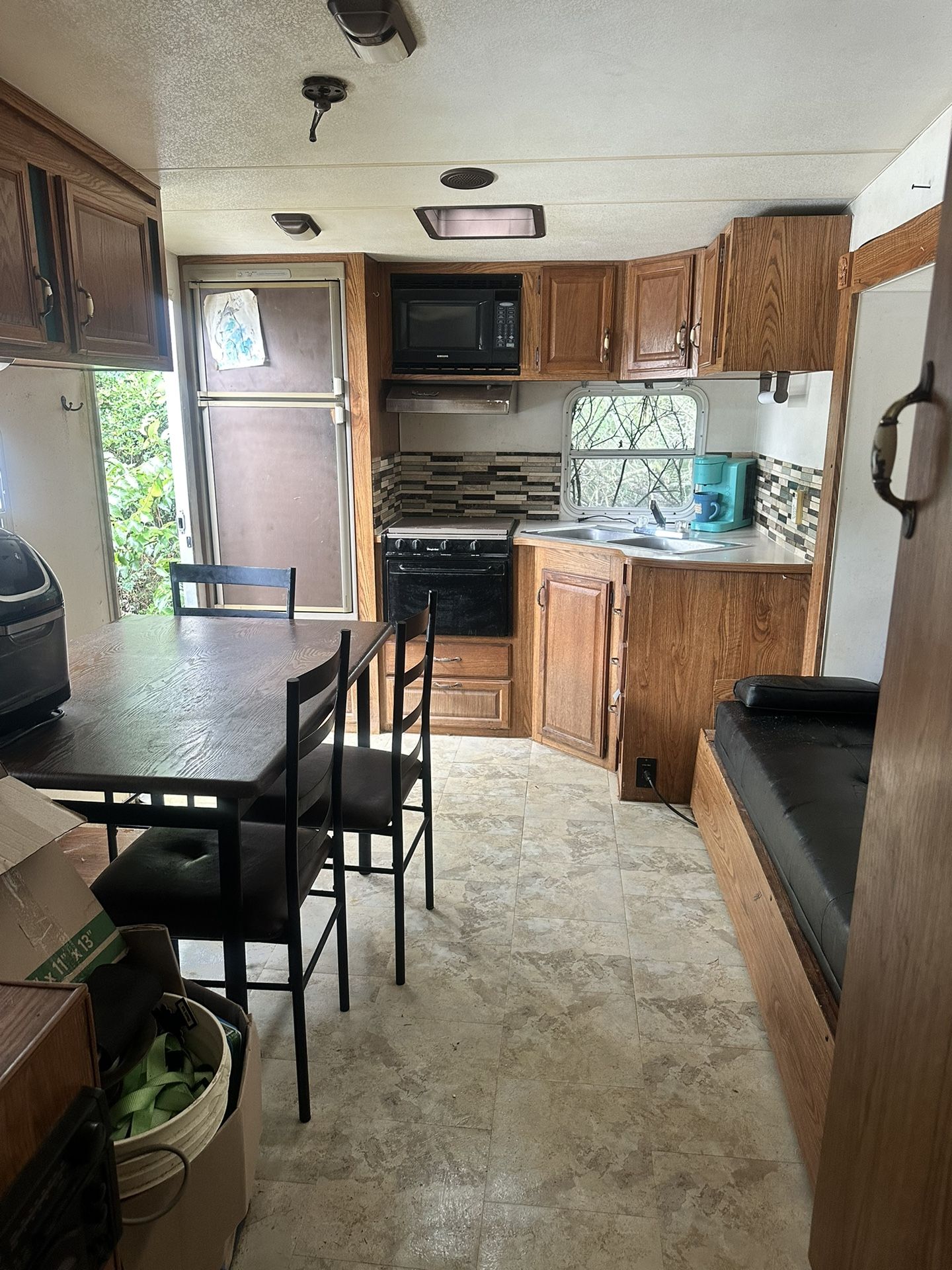 Fridge and microwave work Ac works and window unit for bedroom. Queen mattress or a full will fit. Currently have shelves and a full. Futon in living room Sleeps 3 comfortably Has a bathtub / Shower combo. Park model Needs couple small repairs. -The skylight in the bathroom needs replaced. No major damage. Has one soft spot by front door. Electric lift and 1 slide out. It’s 30 Amp Cute camper great bones ready for a makeover Will post more pictures as I start renovating. Price will go up once it’s complete. Text 832:497:0507