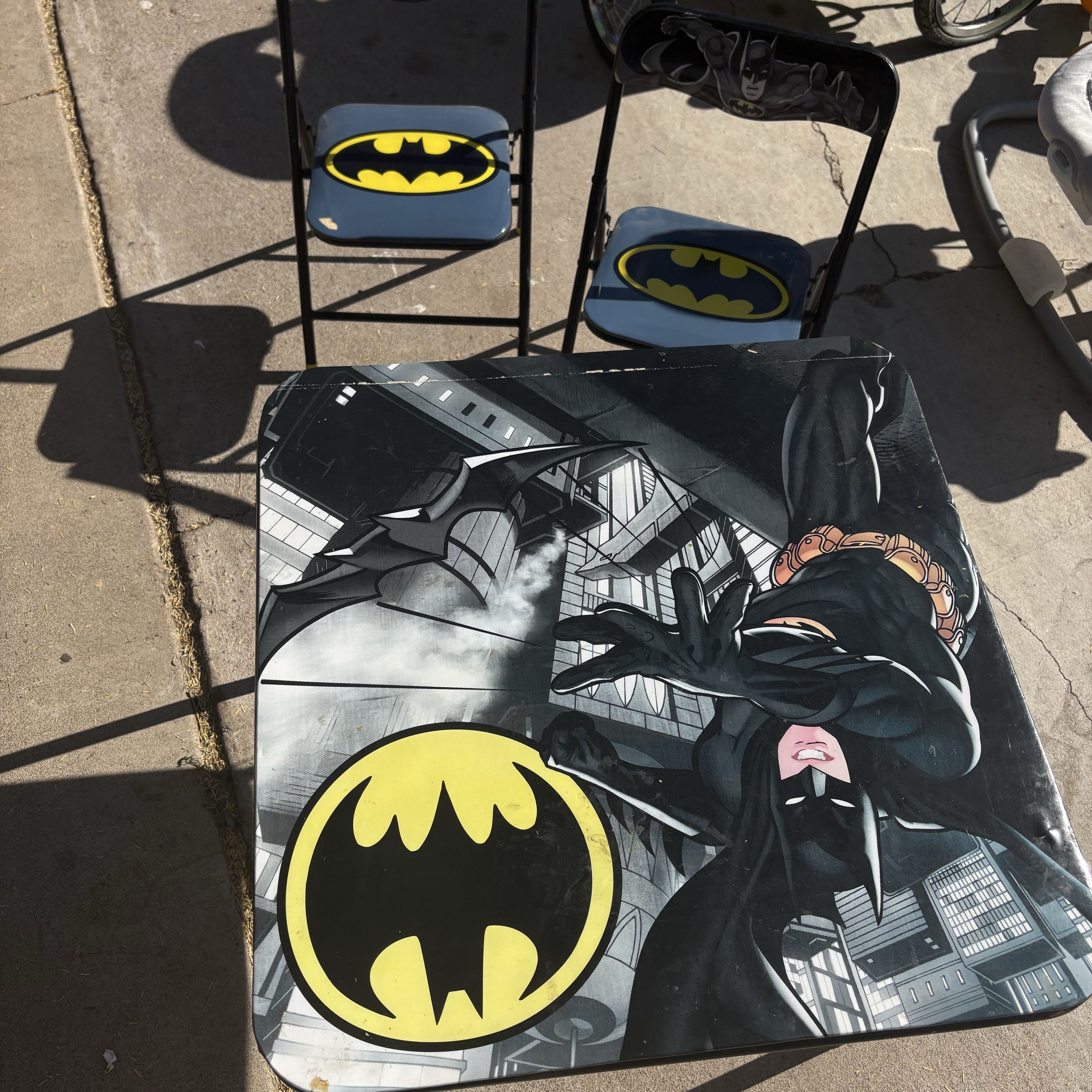Black metal folding table with 2 matching chairs. Batman logo design on table top and chair backs.