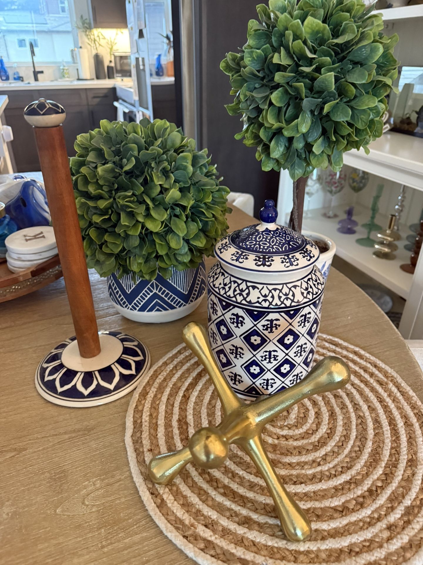 Blue And White Chinoiserie Coastal Faux Topiary Plants Home Decor Paper Towel Holder